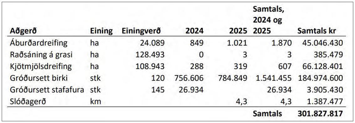 Í samantekt Garðars og Hreins kemur líka fram að umsvif Lands og skógar hafa verið umtalsverð í sveitarfélaginu á síðustu tveimur árum. Borið hefur verið á tilbúinn og lífrænn áburður á um 2.400 hektara, auk þess sem gróðursett hefur verið um 1,5 milljónir birkiplantna í valin svæði. Jafnframt voru lagðir 4,3 km af slóðum. Áætlaður heildarkostnaður LOGS við framkvæmdir árin 2024 og 2025 eru tæpar 300 milljónir króna í Rangárþingi ytra.