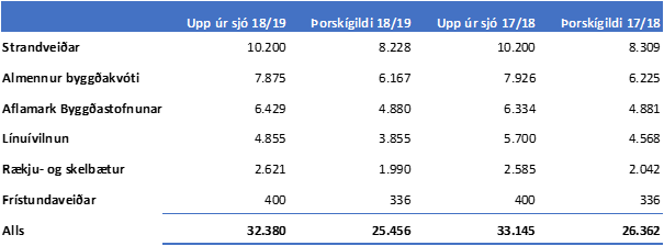 Kristján Þór Júlíusson, sjávarútvegs- og landbúnaðarráðherra, úthlutar nú 32.380 tonnum upp úr sjó eða alls 25.456 þorskígildistonnum vegna þessa á fiskveiðiárinu 2018/2019. Til samanburðar var á fiskveiðiárinu 2017/2018 úthlutað 33.145 tonnum upp úr sjó eða alls 26.362 þorskígildistonnum.