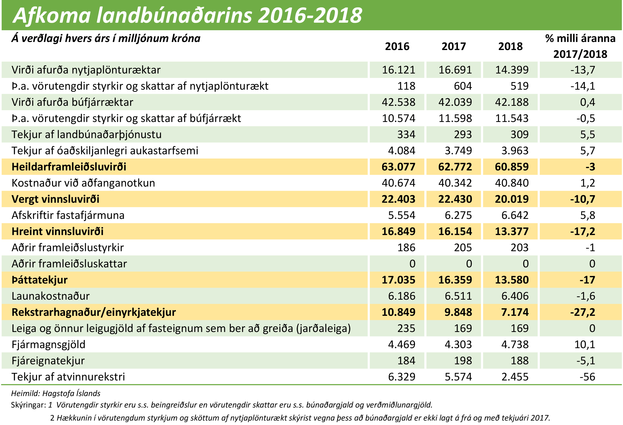 Samkvæmt upplýsingum á vef Hagstofu Íslands lækkaði framleiðsluvirði landbúnaðar á Íslandi um 3% árið 2018. Heildarframleiðsluvirði landbúnaðarins fyrir árið 2018 var 60,9 milljarðar á grunnverði að meðtöldum vörustyrkjum en að frátöldum vörusköttum.