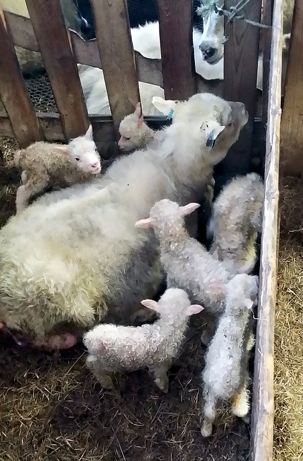 Ærin Sarabía í Húsavík á Ströndum bar sex sprækum lömbum
