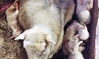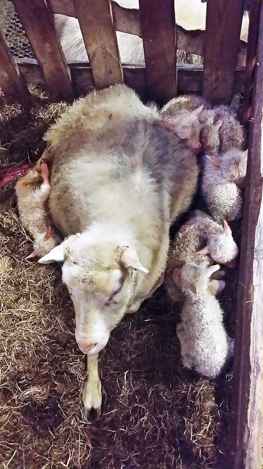 „Við stóðum yfir henni meðan hún bar, en hún skilaði lömbunum öllum skammlaust án hjálpar. Eitt eða tvö komu þó á afturfótunum, en öll hin á eðlilegan hátt.“