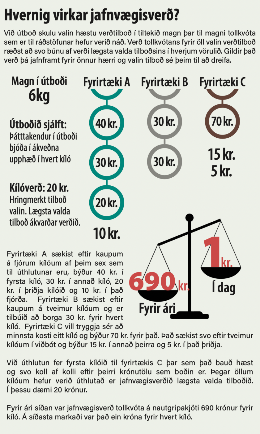 Líkt og Margrét nefnir lækkar jafnvægisverð í öðrum flokkum líka samkvæmt niðurstöðu útboðsins. Þannig fengu tíu fyrirtæki innflutningskvóta fyrir 350 tonn af svínakjöti á 368 kr/kg, þetta verð var 553 krónur í fyrra.