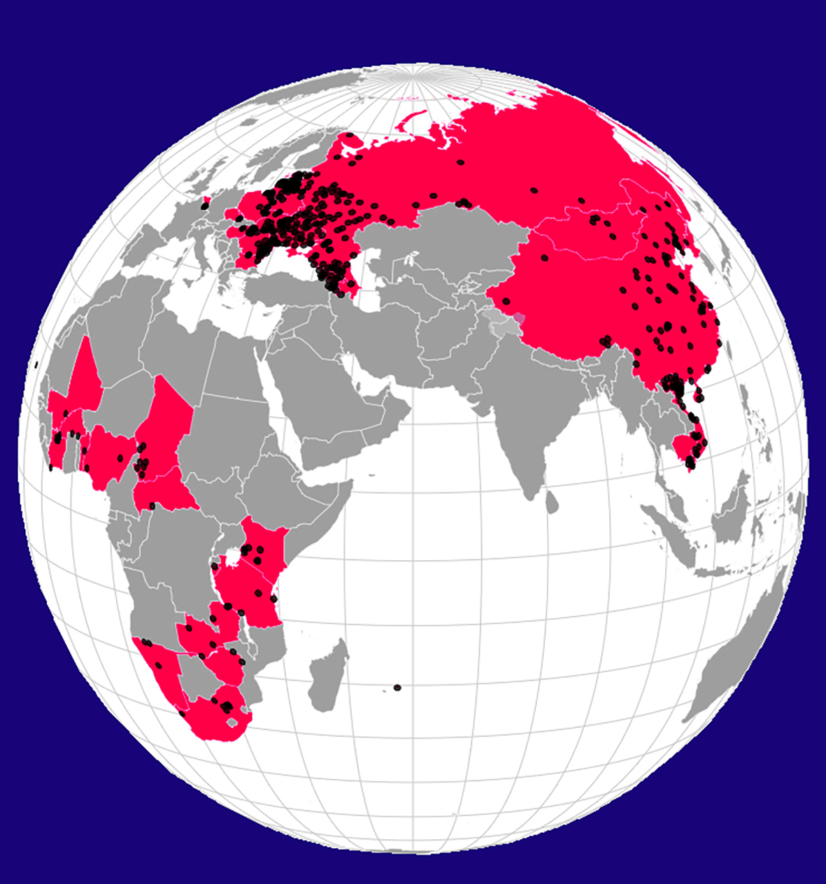 Samkvæmt gögnum Matvæla- og landbúnaðarstofnunar Sameinuðu þjóðanna, FAO, hefur sjúkdómurinn nú breiðst út um allt Kína og einnig til Hainan-eyju og til fleiri Asíulanda eins og Víetnam, Kambódíu og Mongólíu.