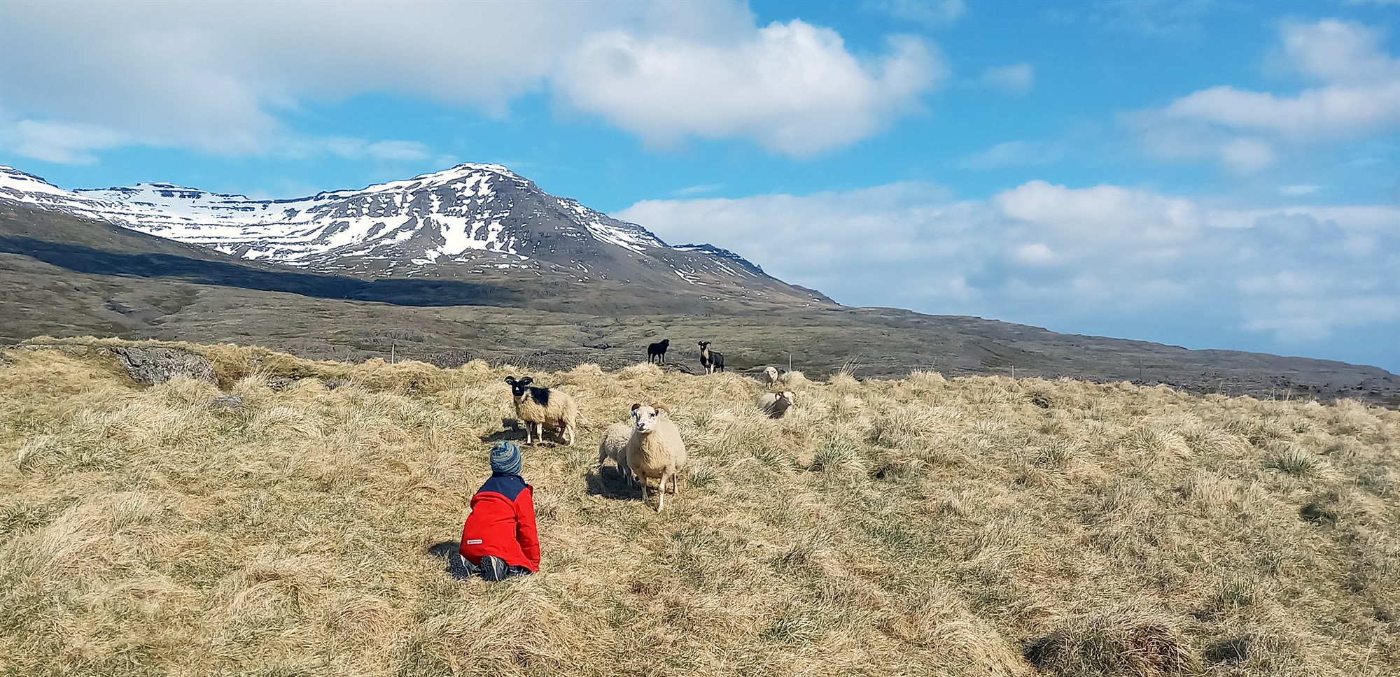 Sævar Kári heilsar upp á kindurnar, sem var haldið eftir heima, þær Betu, Slæðu, Flekku og Láru og lömbin þeirra.