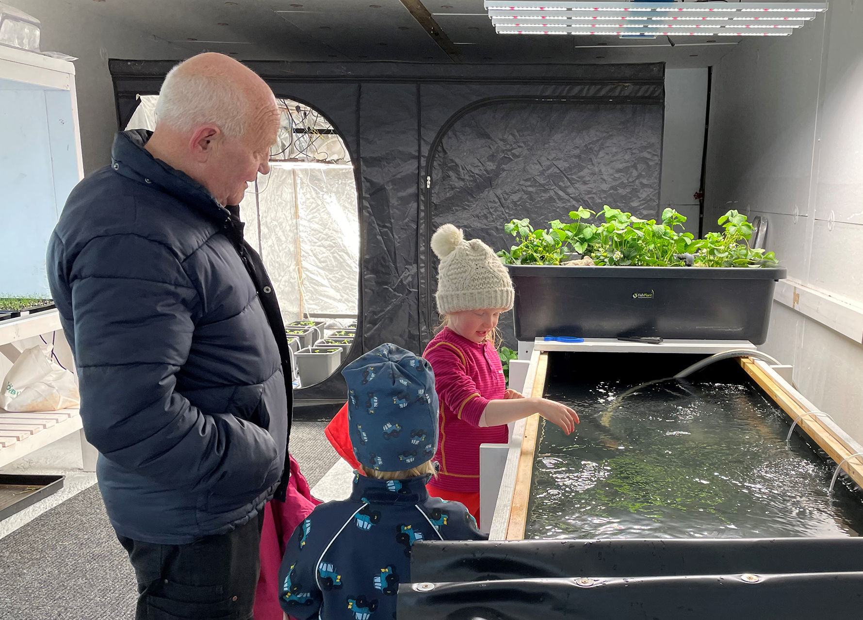 Samrækt (aquaponics). Innst í fræðslusetrinu er innræktun á hampi, jarðarberjum og silungi.