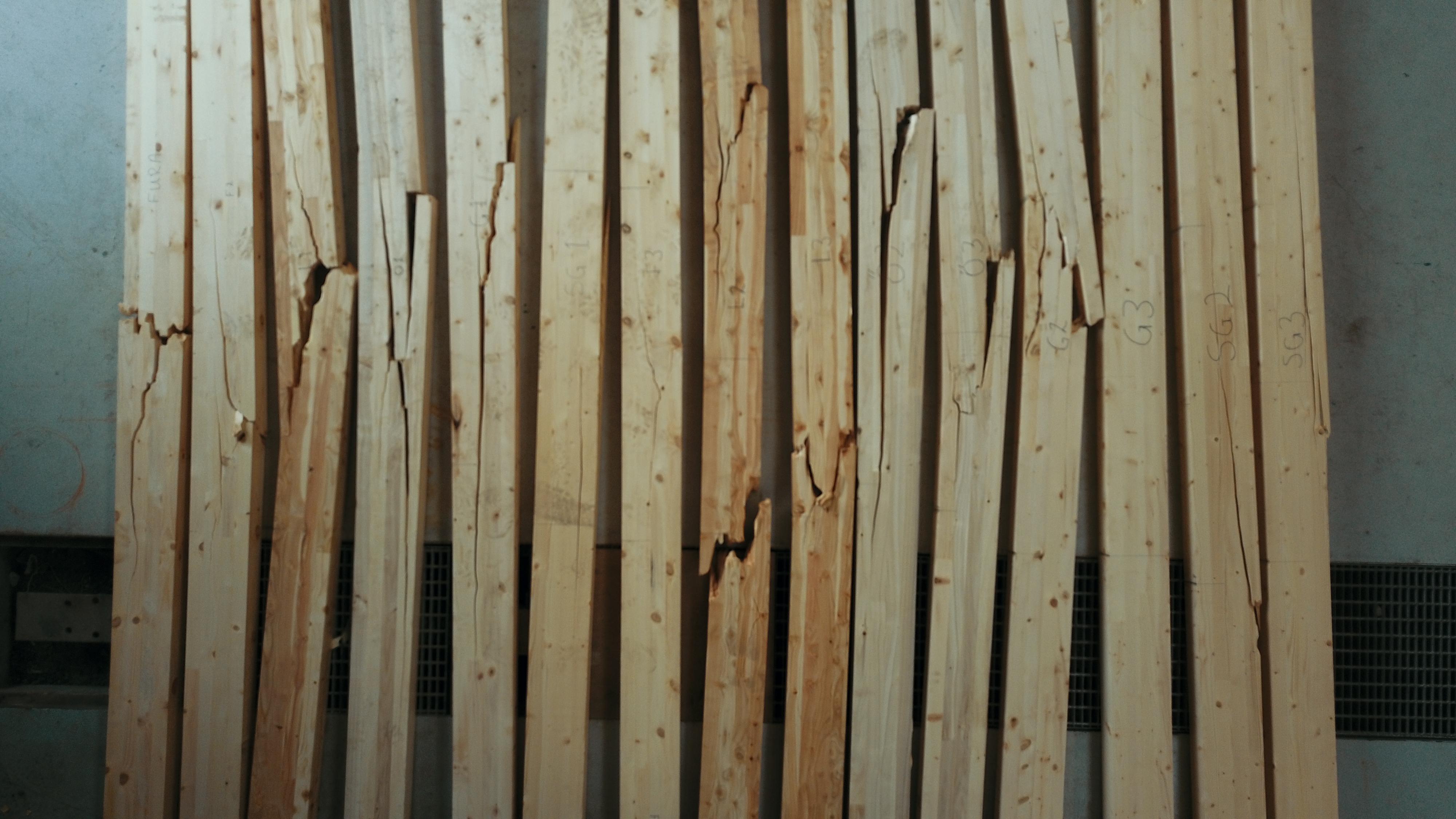 „Eftir að timbrið var orðið þurrt var það flokkað í rétt gæði, gallar skornir úr og efnið fingrað samkvæmt kröfum fyrir efni til límtrésframleiðslu. Teknar voru prufur úr límtrésfjölum, sem voru fingraðar og ekki fingraðar. Þessar prufur voru síðan prófaðar í brotpressu og er það gert til að kanna styrk þessara ólíku viðartegunda og bera hann saman og að lokum voru tólf bitar límdir saman.