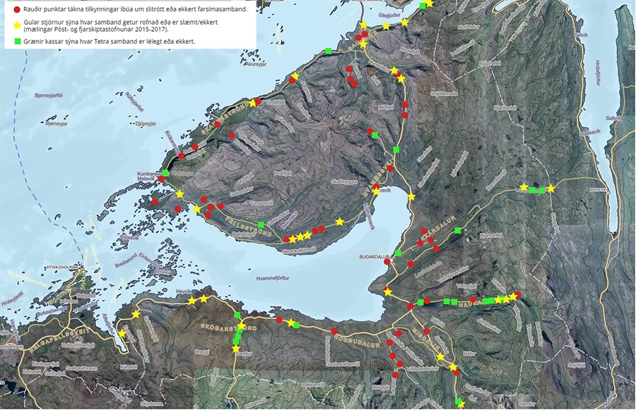 „Á dögunum spurði ég íbúa í Dalabyggð um staði í sveitarfélaginu þar sem farsímasamband væri lélegt eða ekkert. Fjöldi þeirra kom virkilega á óvart og þegar búið var að setja þessa punkta inn á kort af sveitarfélaginu var dreifing þeirra mjög víða. Ofan á þær merkingar bætti ég við punktum hvar mælingar Póst- og fjarskiptastofnunar frá árunum 2015-2017 sýndu að GSM, 3G og 4G gæti rofnað eða væri slæmt/ekkert og að lokum hvar Tetra samband væri lélegt eða ekkert. Fjöldi merkinga á kortinu var sláandi (sjá mynd).“