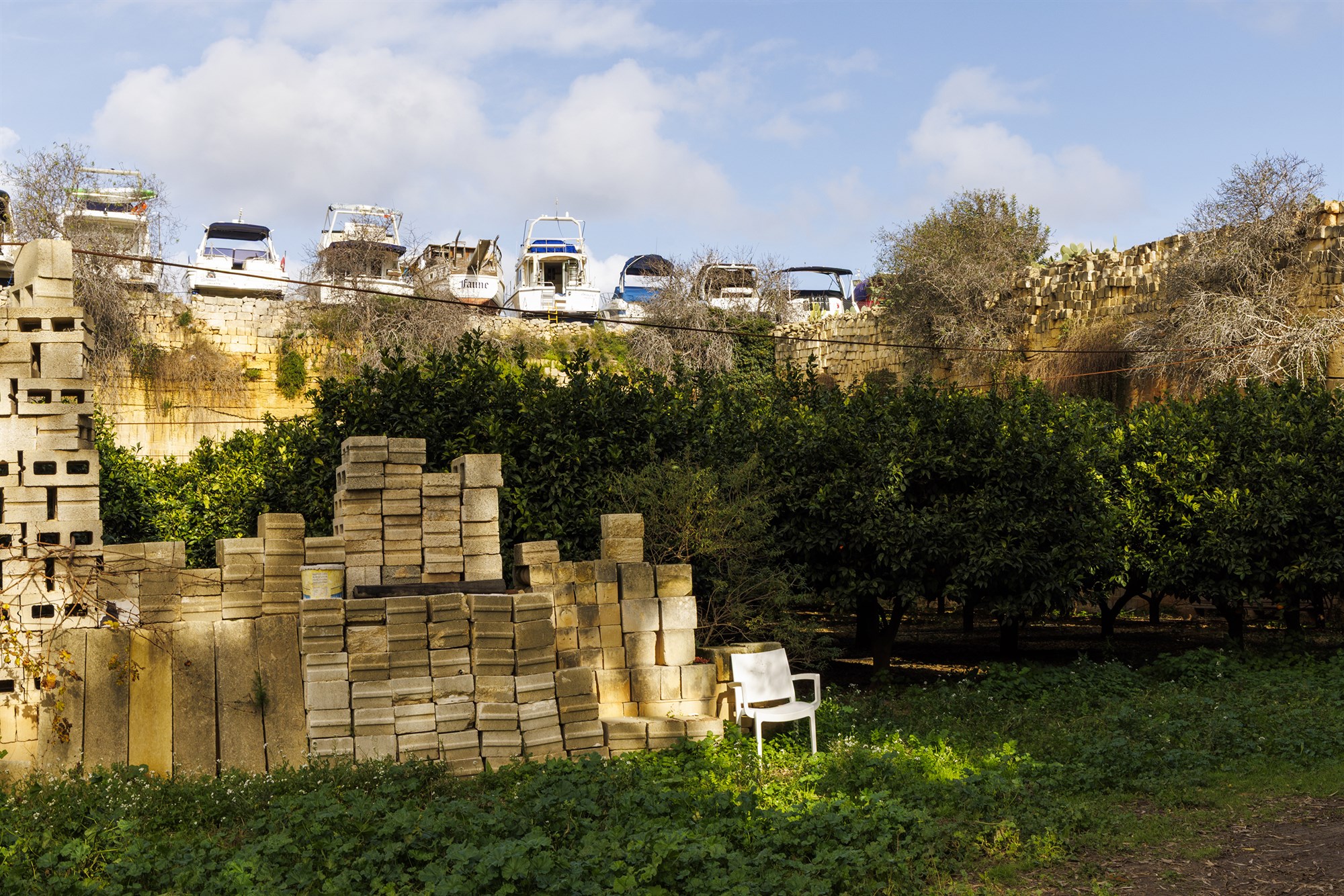 Bræðurnir Victor og Joe starfa allt árið á búgarðinum, en taka einnig að sér verkefni við steinhleðslu. Á jörðinni er líka ræktaður vínviður, grasker, kartöflur, sítrónur, granatepli, korn og fleira og því alltaf ólíkar nytjaplöntur í árstíð. Uppskerutími appelsínanna á Möltu stendur að jafnaði frá nóvember fram í febrúar. Ávextirnir eru klipptir með höndum þegar þeir hafa náð fullum þroska og gefur hvert tré stöðugt af sér nýjar appelsínur á meðan uppskeran stendur yfir.