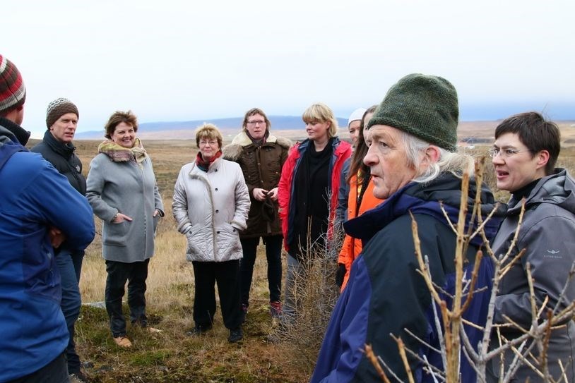Ráðherra og fylgdarlið heimsóttu í för sinni skógarbændurna Friðrik Jóhannsson og Henrike Wappler sem stunda myndarlega skógrækt á Brekkulæk í Miðfirði meðfram lífrænni sauðfjárrækt. Þau hafa náð mjög góðum árangri með skógrækt sína í héraði sem gjarnan hefur verið álitið lítt til skógræktar fallið.