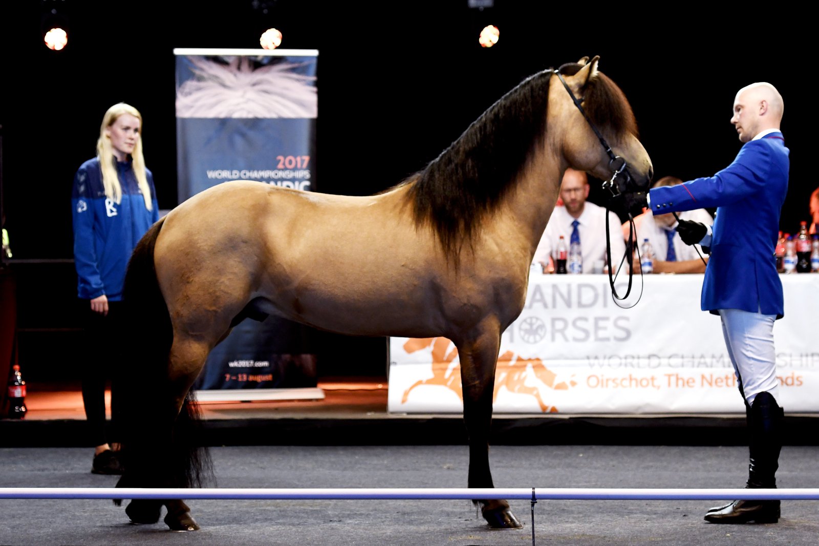 Góður rómur var gerður að kynbótasýningu heimsmeistaramóts íslenska hestsins í Hollandi enda umgjörðin glæsileg. Fyrsti dagur mótsins var helgaður byggingardómum kynbótahrossa en þeim var stillt upp á sviði fyrir framan allt að 300 gesti sem fylgdust með dómurum meta og kveða upp dóm á þeim.