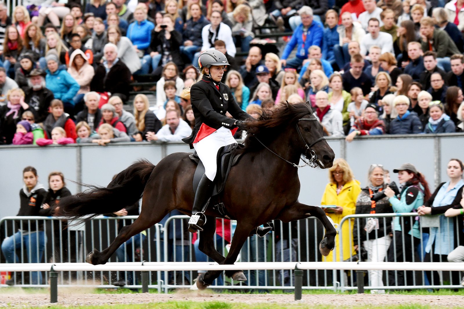 Glódís vom Kronshof er hér á fljúgandi skeiði. Hún er undan Depil frá Votmúla og Næpu vom Kronshof. Ræktandi og knapi er Frauke Schenzel.