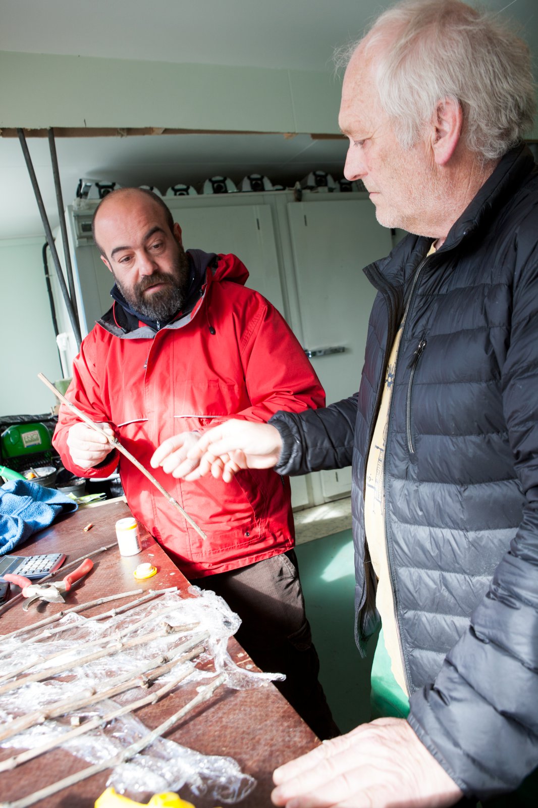 Alessandro og Ingólfur fara yfir málin; hvernig farsælast sé að planta græðlingunum. Tveir þriðju hlutar sprotans eru settir niður, eða þannig að aðeins eitt brum sé ofan jarðar.