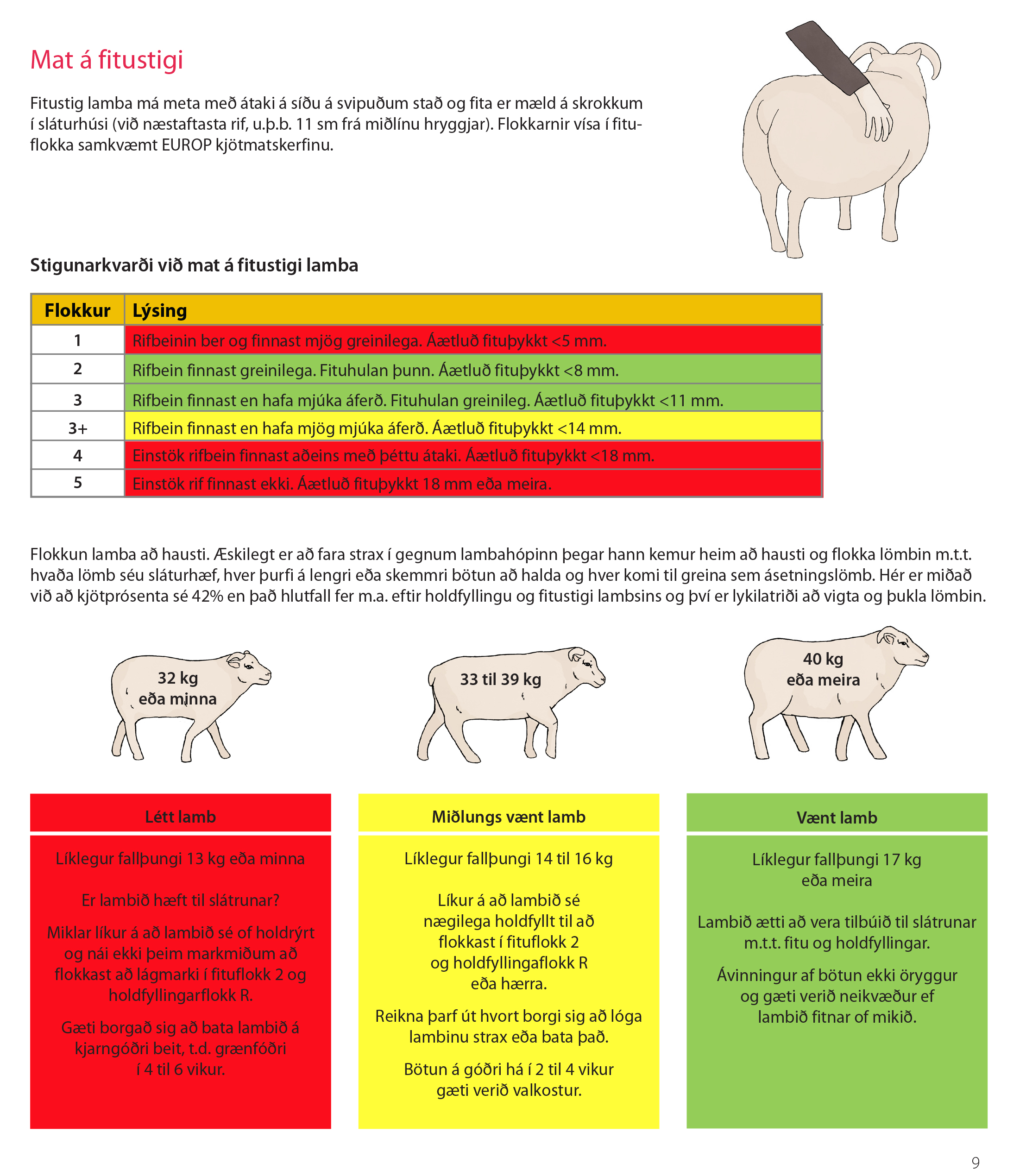 Sýnishorn úr bæklingnum þar sem fjallað er um mat á fitustigi og flokkun lamba að hausti.