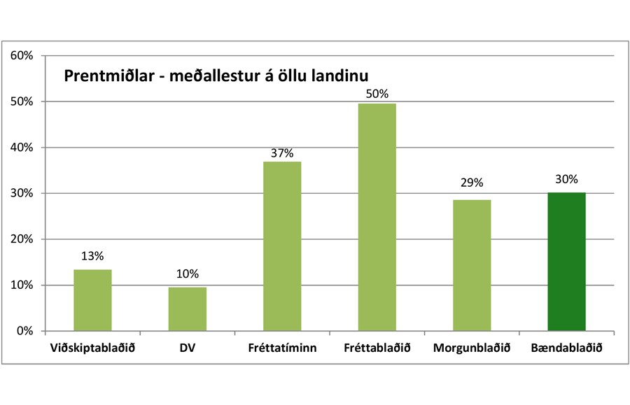 Bændablaðið mælist með 30% lestur yfir landið allt og á landsbyggðinni ber það höfuð og herðar yfir önnur blöð með 45% meðallestur. Til samanburðar mælist Fréttablaðið með 31% lestur á landsbyggðinni, Morgunblaðið 26% og Fréttatíminn 20%.