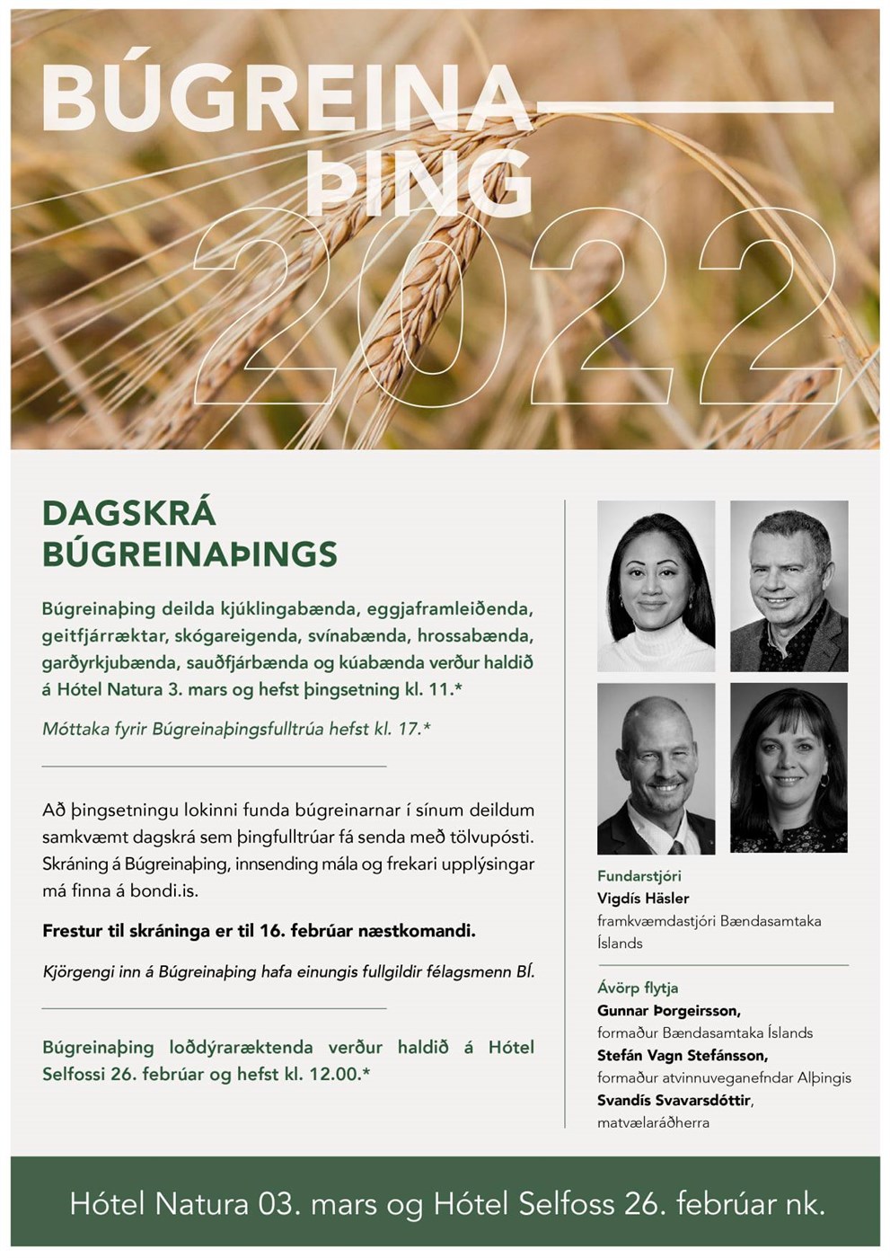 Búgreinaþing búgreinadeilda Bændasamtaka Íslands er nú haldið í fyrsta sinn á Hótel Natura í Reykjavík, dagana 3. og 4. mars, þar sem bændur allra búgreina koma saman til þings um málefni íslensks landbúnaðar undir yfirskriftinni Samstíga landbúnaður. Setningarathöfn verður klukkan 11:00 fimmtudaginn 3. mars þar sem Gunnar Þorgeirsson, formaður Bændasamtakanna, Svandís Svavarsdóttir, matvælaráðherra og Stefán Vagn Stefánsson, formaður atvinnuveganefndar Alþingis flytja erindi.