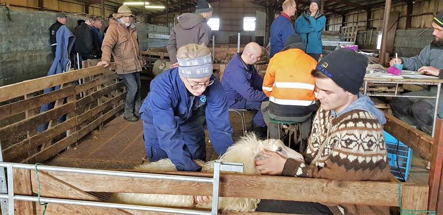 Guðrún Hildur að dæma í fjárhúsinu í Þjóðhólfshaga. Ritarinn er klár að skrifa niður tölurnar og þarna má líka sjá Pétur ómskoða hrút.