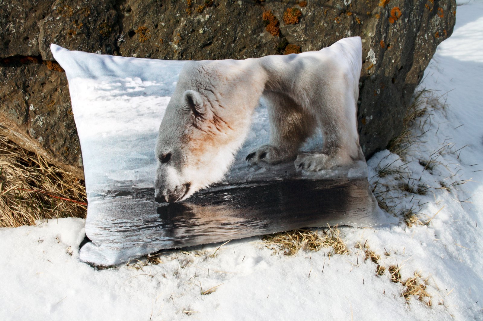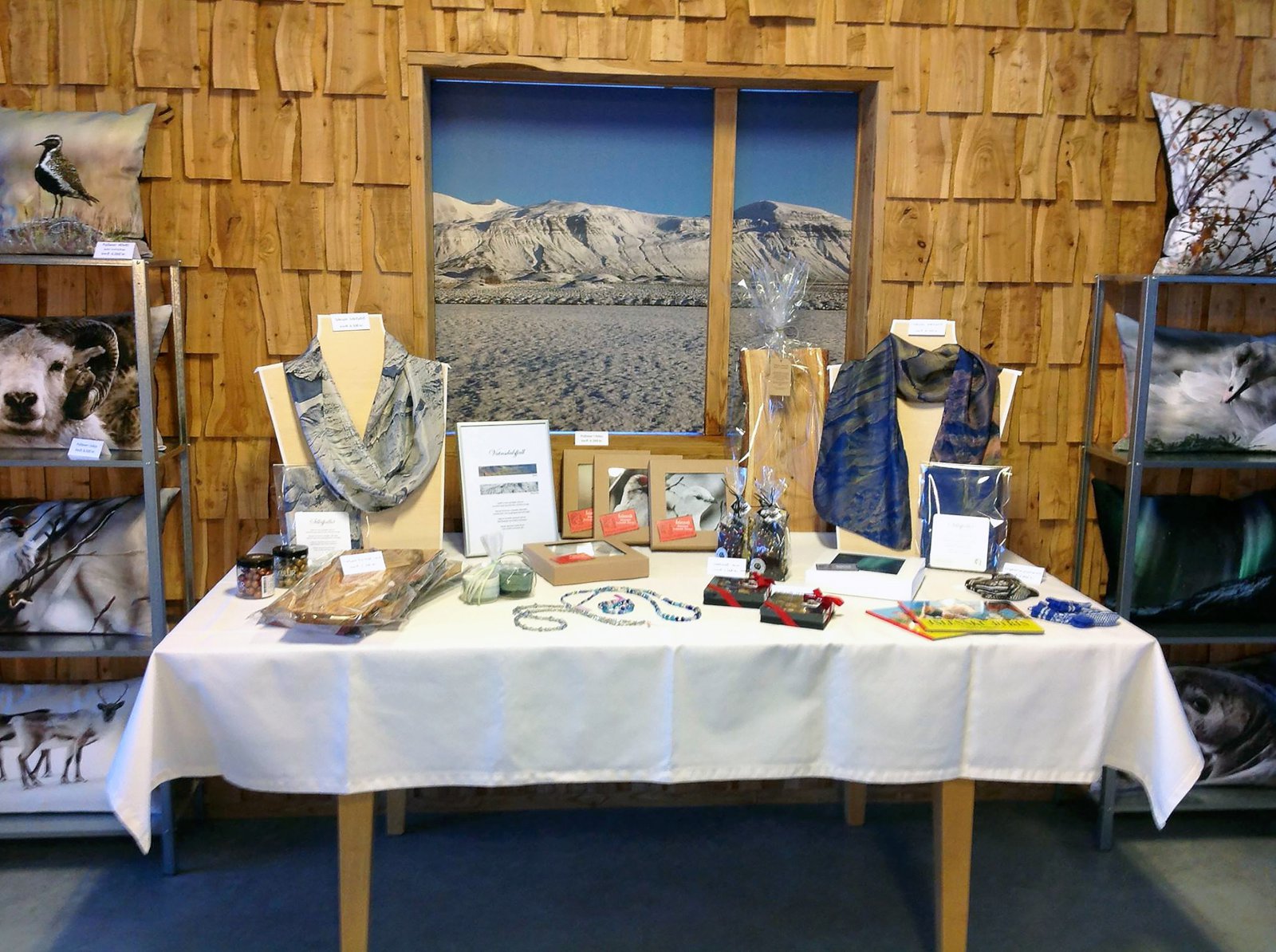 „Hér á bænum var vannýtt gömul bygging, eða gamla fjósið sem nýtt hafði verið sem geymsla. Við tókum það í gegn fyrir þessa starfsemi. Til þessa hef ég fyrst og fremst verið að selja púðaver og læt ég þá prenta fyrir mig á efni ljósmyndir úr náttúru Íslands. Núna er ég að bæta við mig með þessum svuntum og fleiru.“