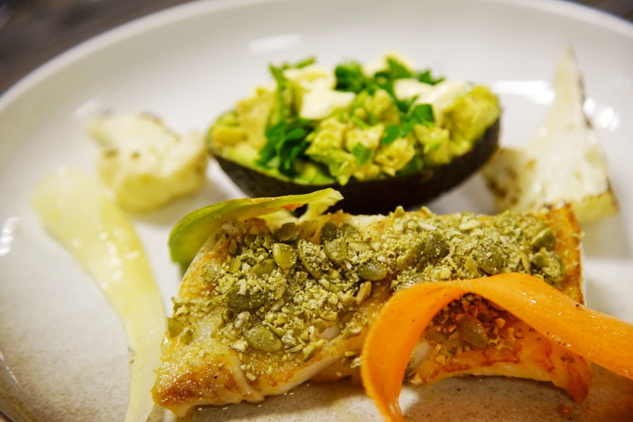 Hér er uppskrift að bökuðum fiski með stökkri og kryddaðri áferð – með muldum fræjum. Hægt er að nota þorsk eða löngu til dæmis. Avócadosósan fullkomnar réttinn.
