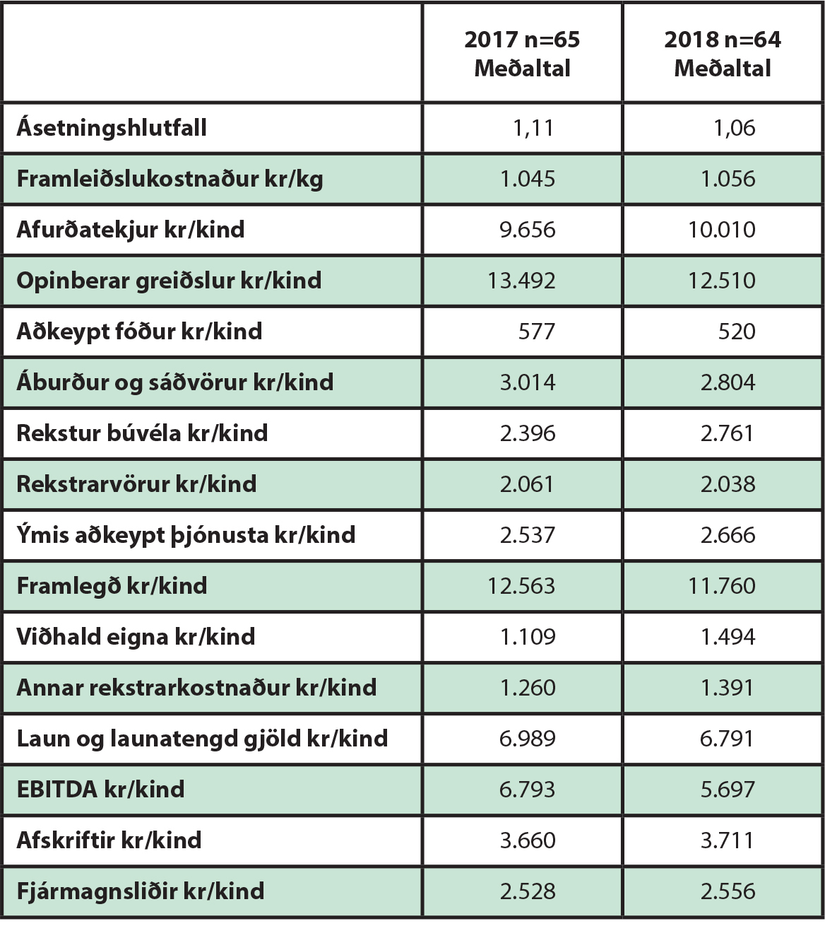 Niðurstöður fyrir árið 2018 sýna í raun lakari rekstrarniðurstöðu en árið 2017. Framleiðslukostnaður er svipaður milli ára á hvert kíló en tekjur lækka milli ára sem skýrist af auknum opinberum greiðslum skv. fjáraukalögum 2017 vegna falls í afurðaverði og hvernig því framlagi var skipt milli búa líkt og getið er um í reglugerð nr. 19/2018 og bókfærðist árið 2017. Hins vegar skal bent á að uppbætur á afurðaverð haustið 2018 eru hjá flestum sláturleyfishöfum bókfærð 2019 og tilheyra því bókhaldsári.