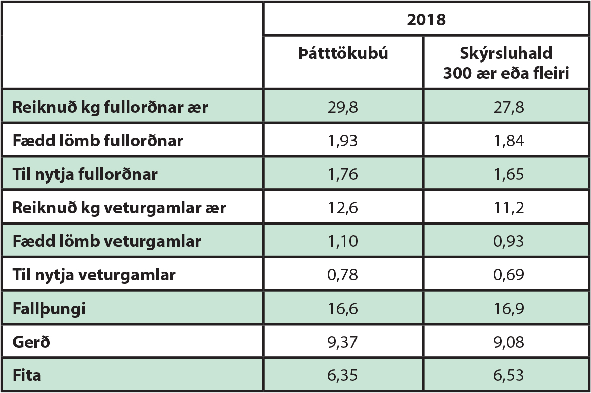 Tafla 2 - Munur á meðaltali skýrsluhaldsniðurstaða hjá þátttökubúum og búum í skýrsluhaldinu með fleiri en 300 skýrslufærðar ær.