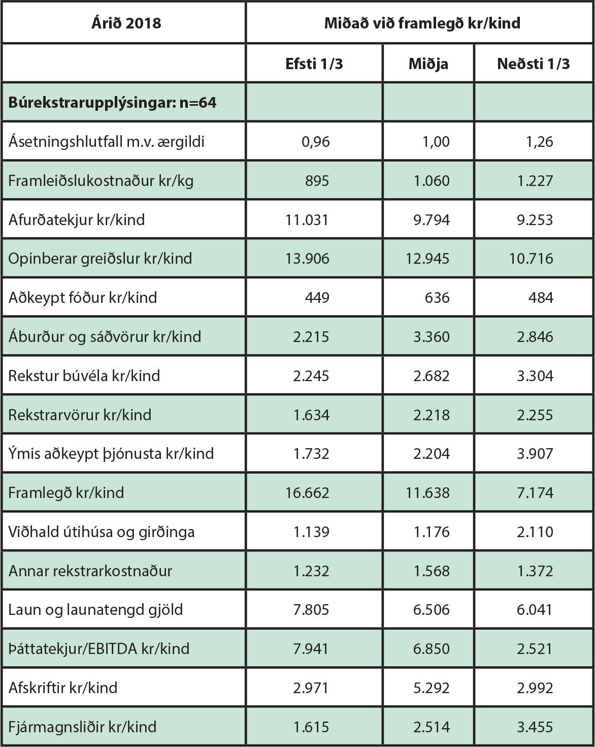 Jafnframt sýna niðurstöðurnar árið 2018 að best reknu búin hafa lægri framleiðslukostnað á hvert kíló dilkakjöts. Í töflu 3 sést að búin í efsta þriðjung eru með framleiðslukostnað upp á 895 krónur á kíló sem er 150 krónum lægra en meðaltal gagnasafnsins.