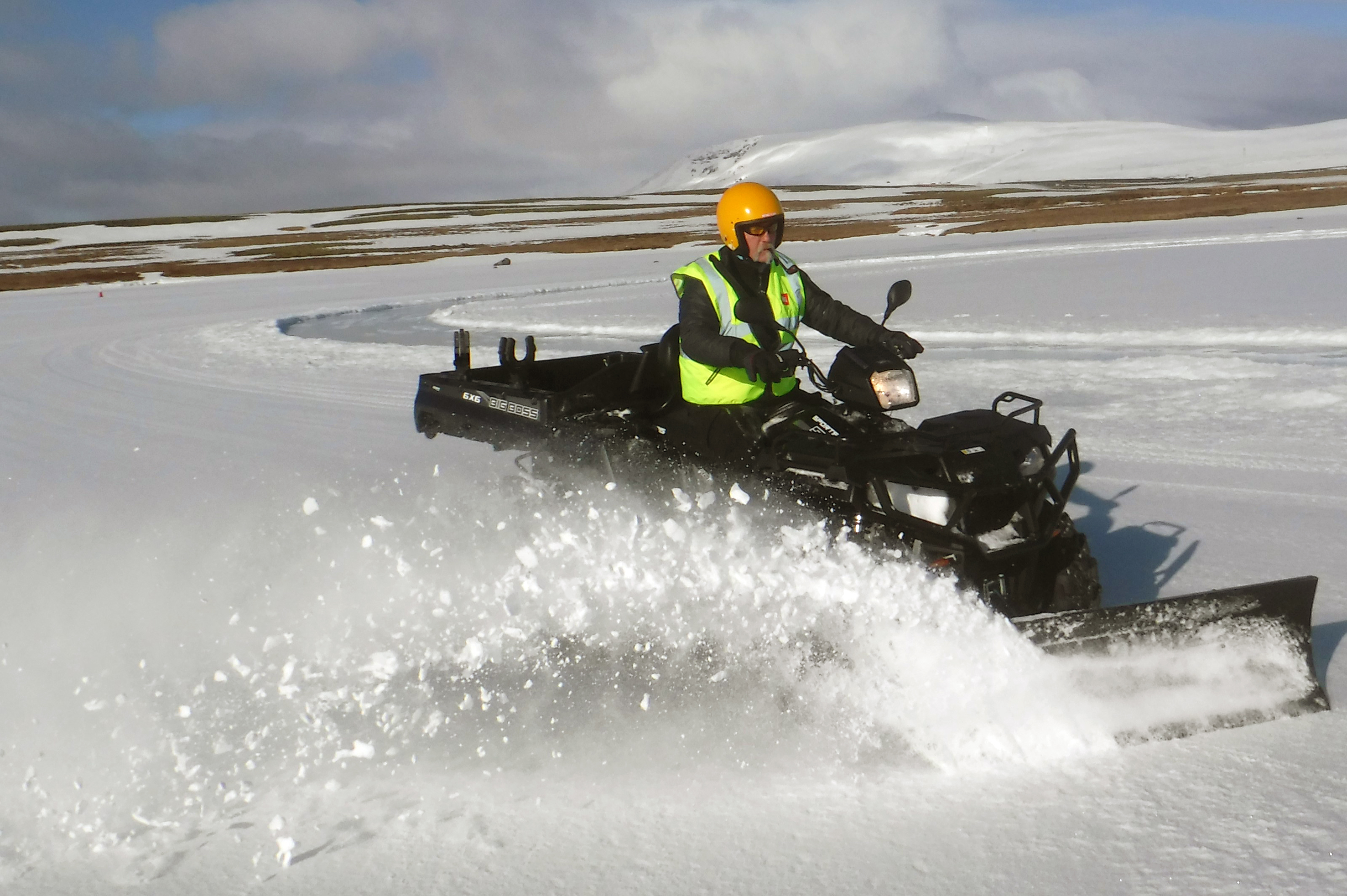 „Bóndabílinn“ væri ég alveg til í að eiga sérstaklega eins og hann var afhentur nýjum eiganda sínum, en þá var búið að setja hann á belti sem eru sérstaklega ætluð til aksturs á snjó, en gagnast líka vel í miklu votlendi. Einnig prófaði ég sexhjól frá Polaris, en vélin í því var ekki nema 570 cc. Þrátt fyrir litla vél vann það vel við að skafa snjó og krapa.