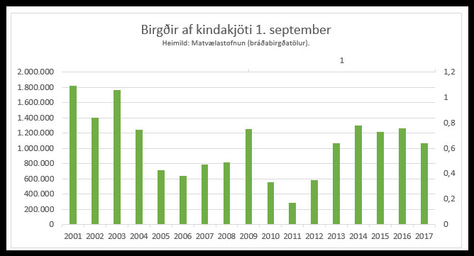 Birgðir 1. september síðastliðinn voru 1.063 tonn, en í fyrra voru þær 1.262 tonn. Talið er að frá þessum birgðum muni dragast 500 til 600 tonn áður en nýtt kjöt kemur að fullu inn á markaðinn, þar sem sala á innanlandsmarkaði sé um 560 tonn á mánuði að meðaltali.