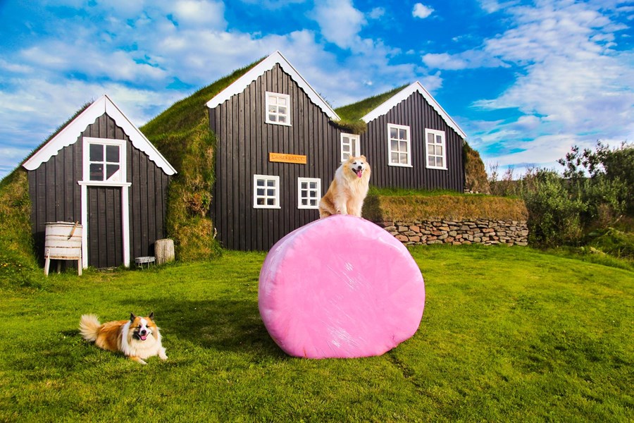 Skylt efni: heyrúllur | bleikar og bláar heyrúllur | Krabbameinsfélagið