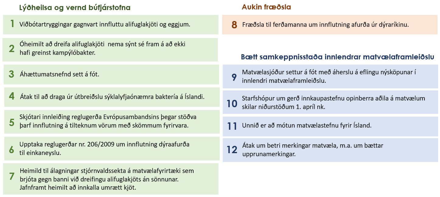 Stjórnvöld hafa undanfarið ár unnið að umfangsmikilli aðgerðaáætlun sem sem tekur til margra þátta og miðar að því að efla matvælaöryggi, tryggja vernd búfjárstofna og bæta samkeppnisstöðu innlendrar matvælaframleiðslu. Verður gripið til þeirra aðgerða samhliða afnámi þess leyfisveitingakerfis sem nú gildir um innflutning á kjöti og eggjum og dæmt hefur verið ólögmætt. Vakin er athygli á því að með frumvarpinu eru ekki gerðar breytingar á skilyrðum á innflutningi búvara sem upprunnar eru utan EES-svæðisins.