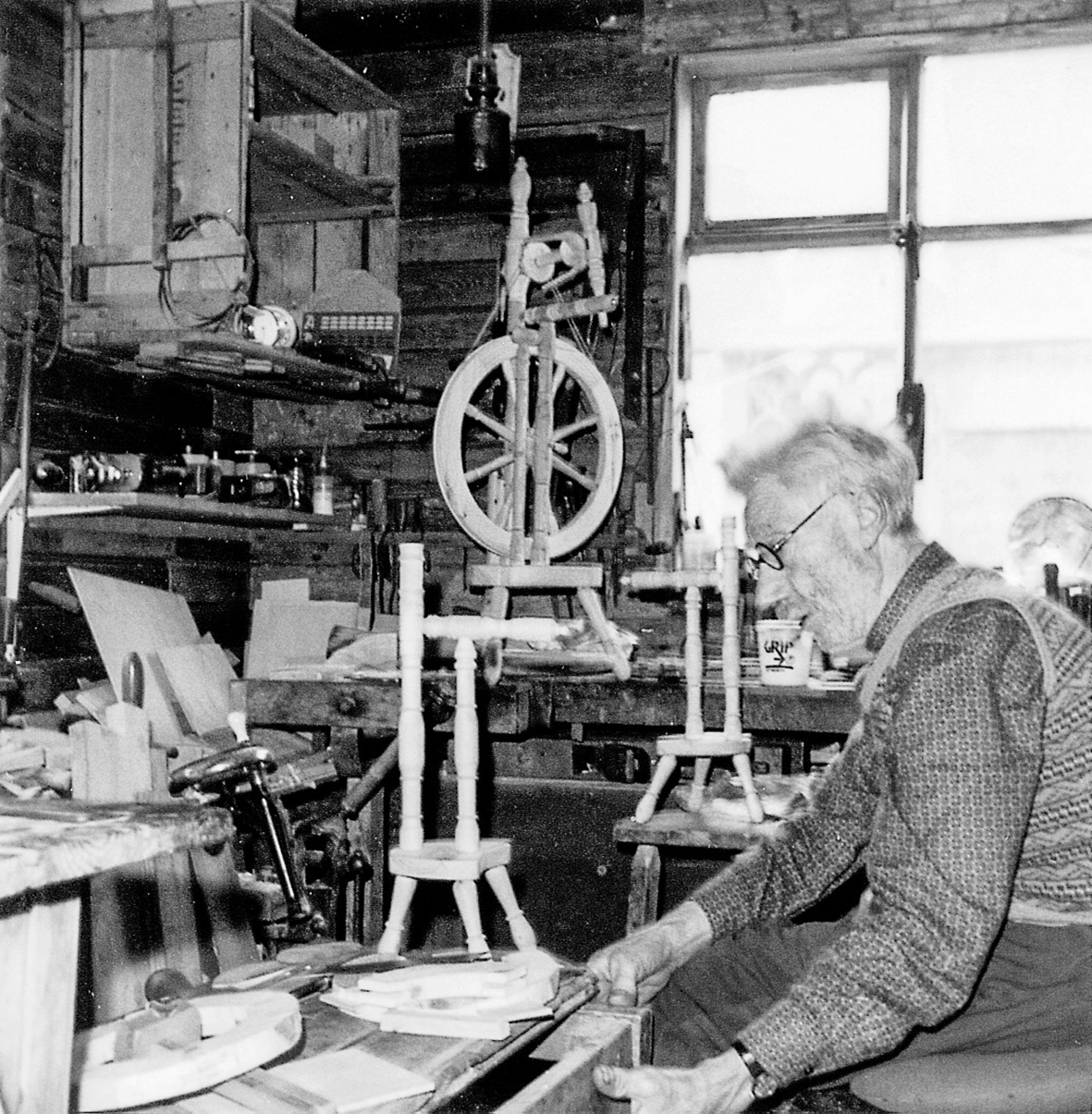 Sæmundur Jónsson rokka- og söðlasmiður að störfum á verkstæði sínu á Ólafsfirði.