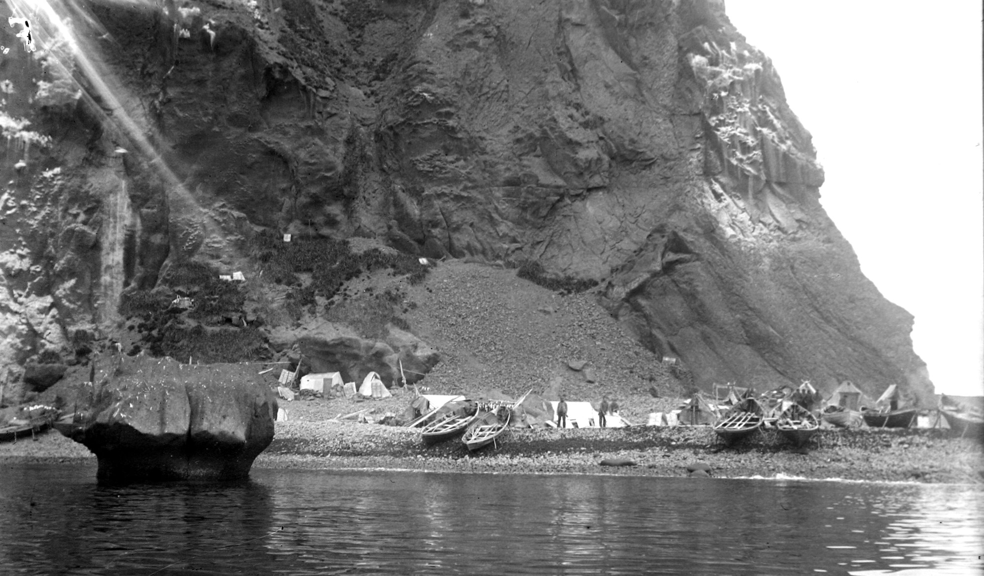 Einstakar myndir úr Drangey sem birtar eru í tíundu og síðustu bókinni af Byggðasögu Skagafjarðar. Myndirnar voru teknar af Arthur Cook árið 1919. Myndin tekin af sjó af bátum og athafnasvæði „Fjörubúa¨ í Drangey.