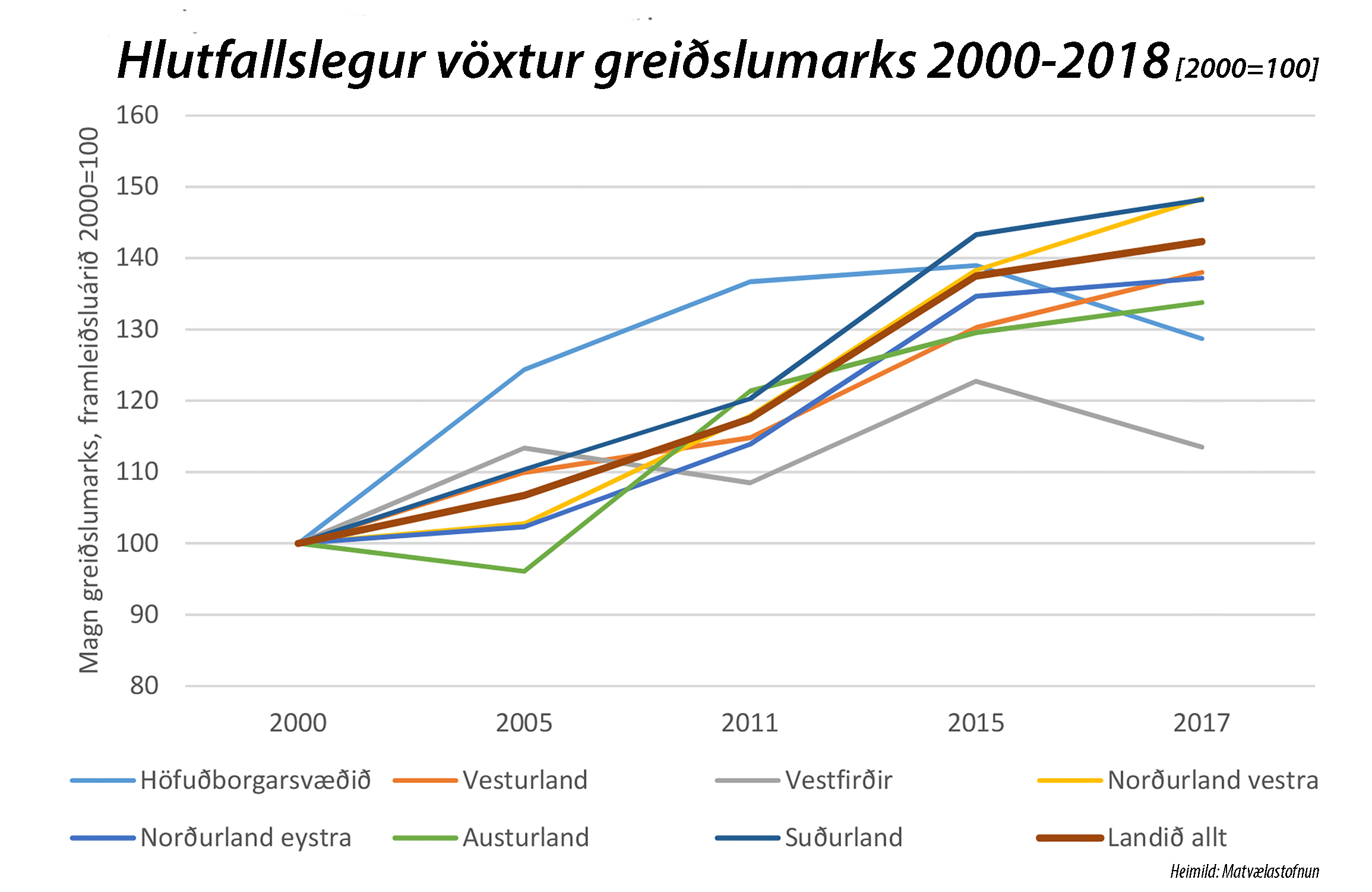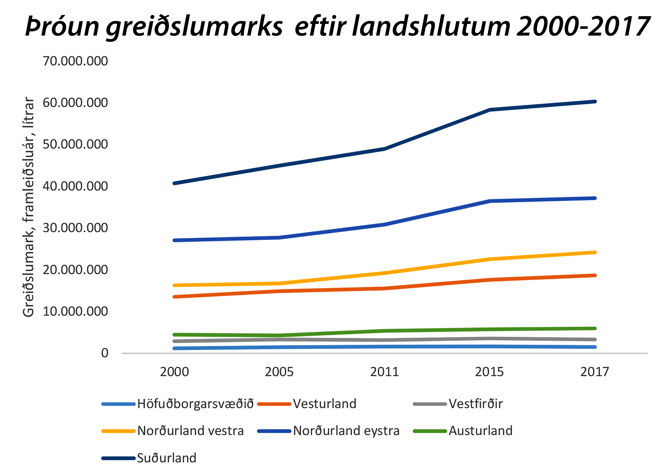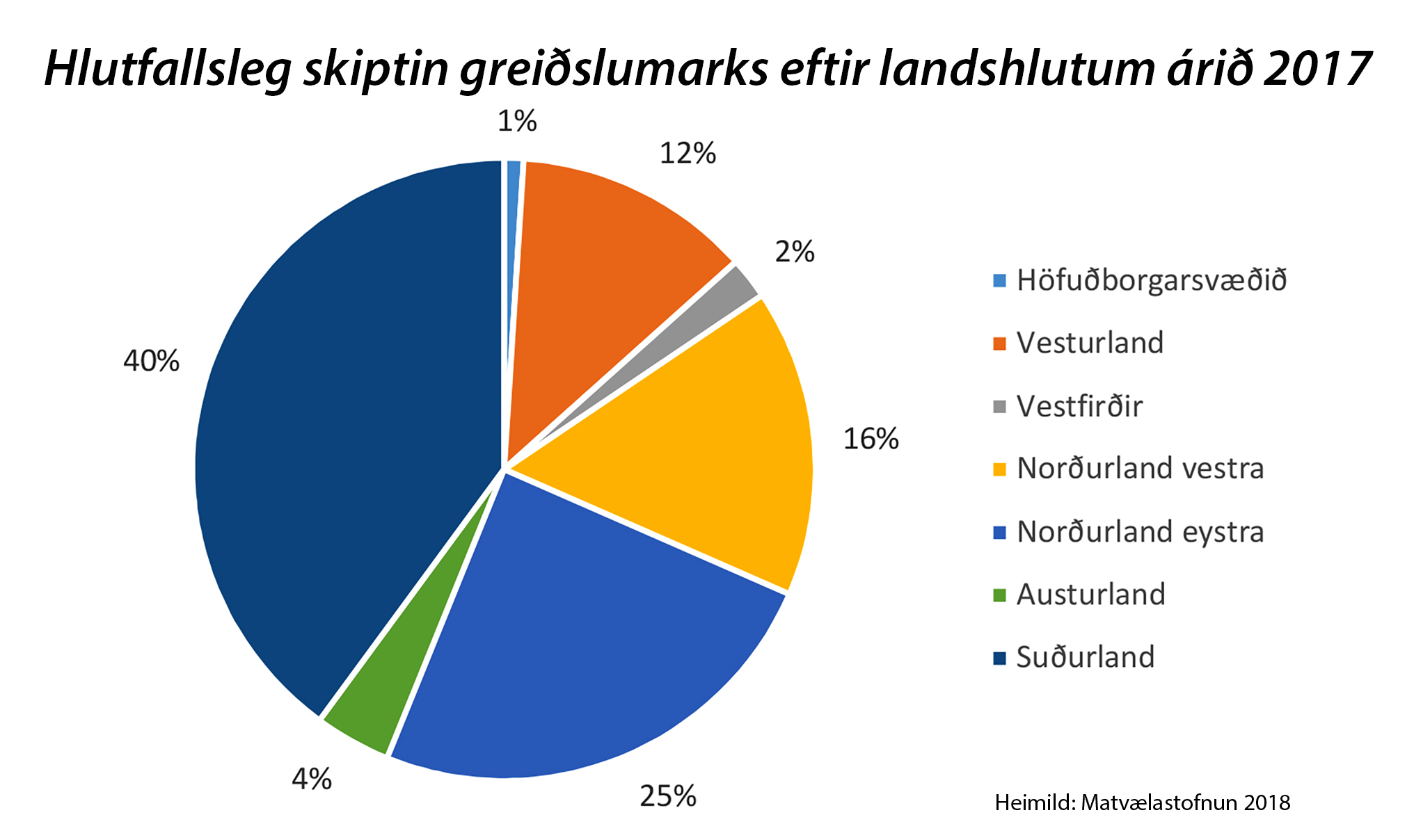 Býlum með greiðslumark hefur fækkað um rúm 40% frá árinu 2000 og hafa býlin stækkað. Árið 2000 voru samtals 1.023 býli með greiðslumark en 597 árið 2017. Fjórir landshlutar voru með 93% greiðslumarks árið 2017, bú á Suðurlandi með 40%,Norðurland eystra með 25%, Norðurland vestra 16% og Vesturland 13%.