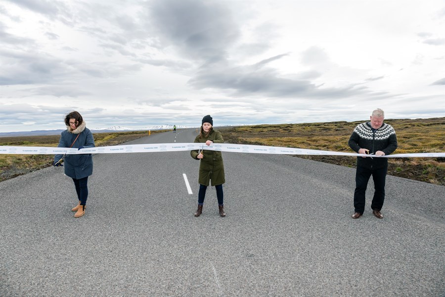 Katrín Jakobsdóttir forsætisráðherra, Sigurður Ingi Jóhannsson samgöngu- og sveitarstjórnarráðherra og Þórdís Kolbrún Reykfjörð Gylfadóttir ferðamála-, iðnaðar- og nýsköpunarráðherra klipptu á borð-ann að loknum ræðum.