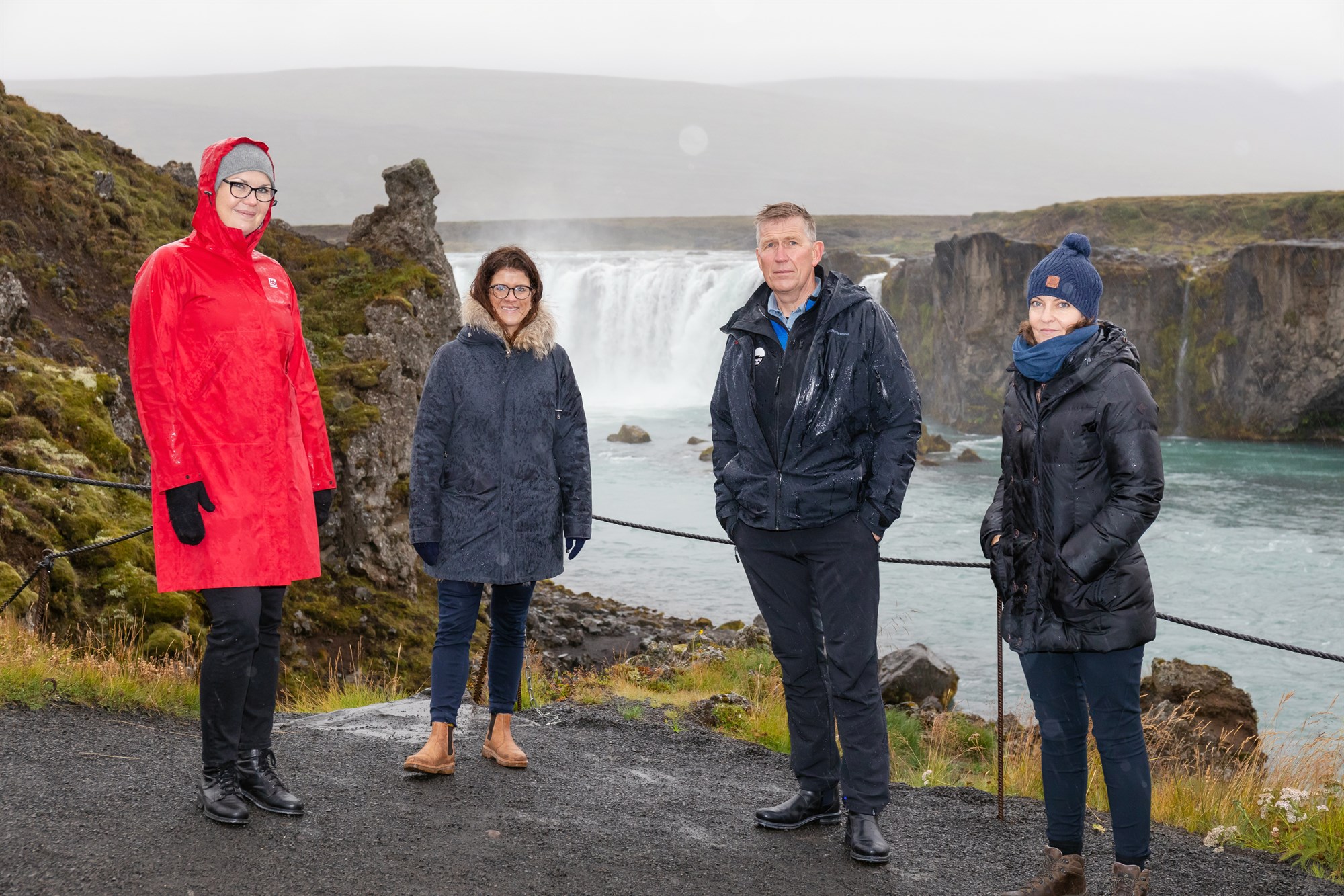 Goðafoss er innan Demantshringsins, hér staldra þau við þann fagra foss, Sigrún Brynja Einarsdóttir, skrifstofustjóri á skrifstofu ferðamála og nýsköpunar í atvinnu- og nýsköpunarráðuneytinu, Þórdís Kolbrún, Viggó Jónsson og Dagbjört Jónsdóttir, sveitarstjóri í Þingeyjarsveit.