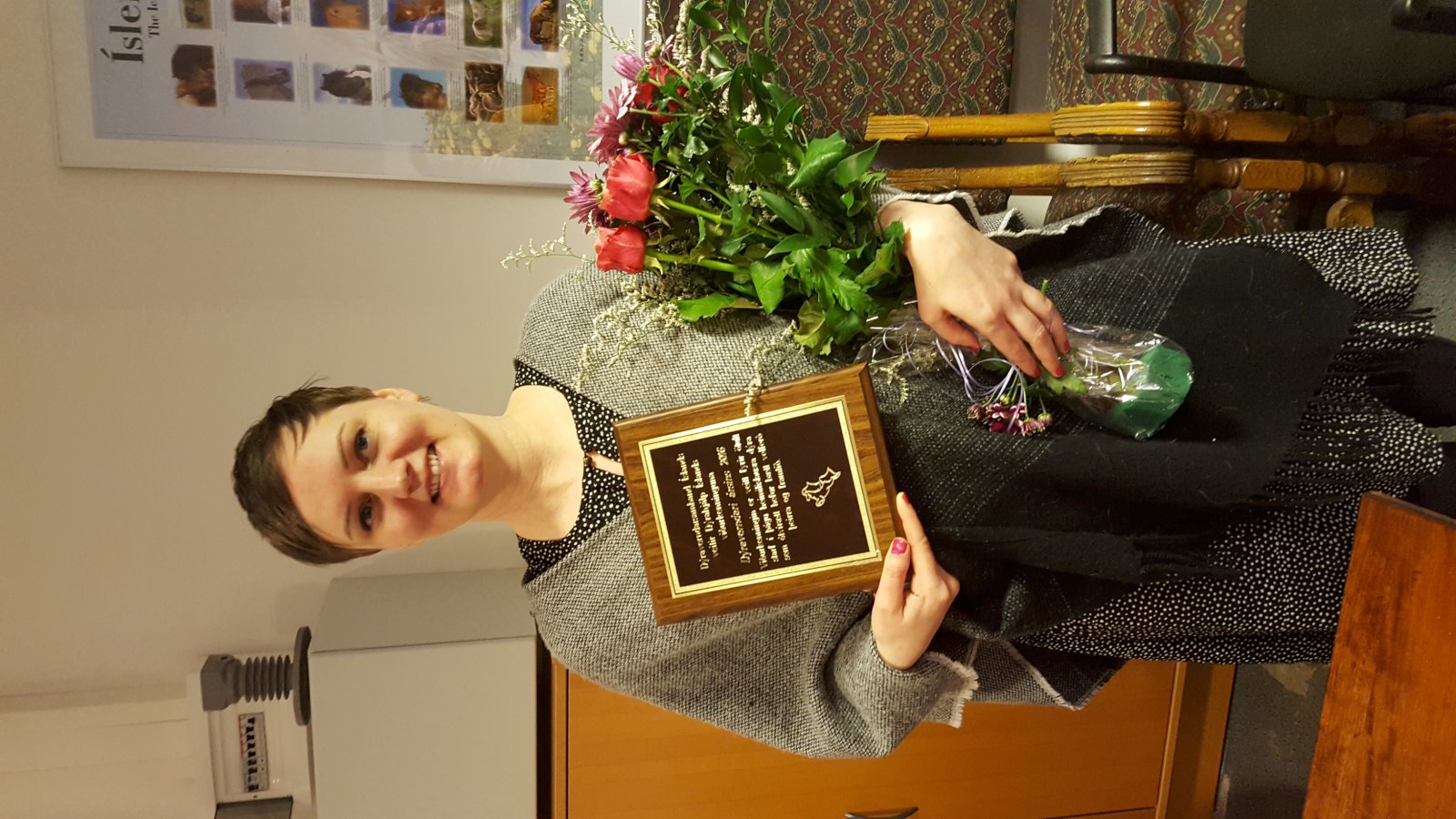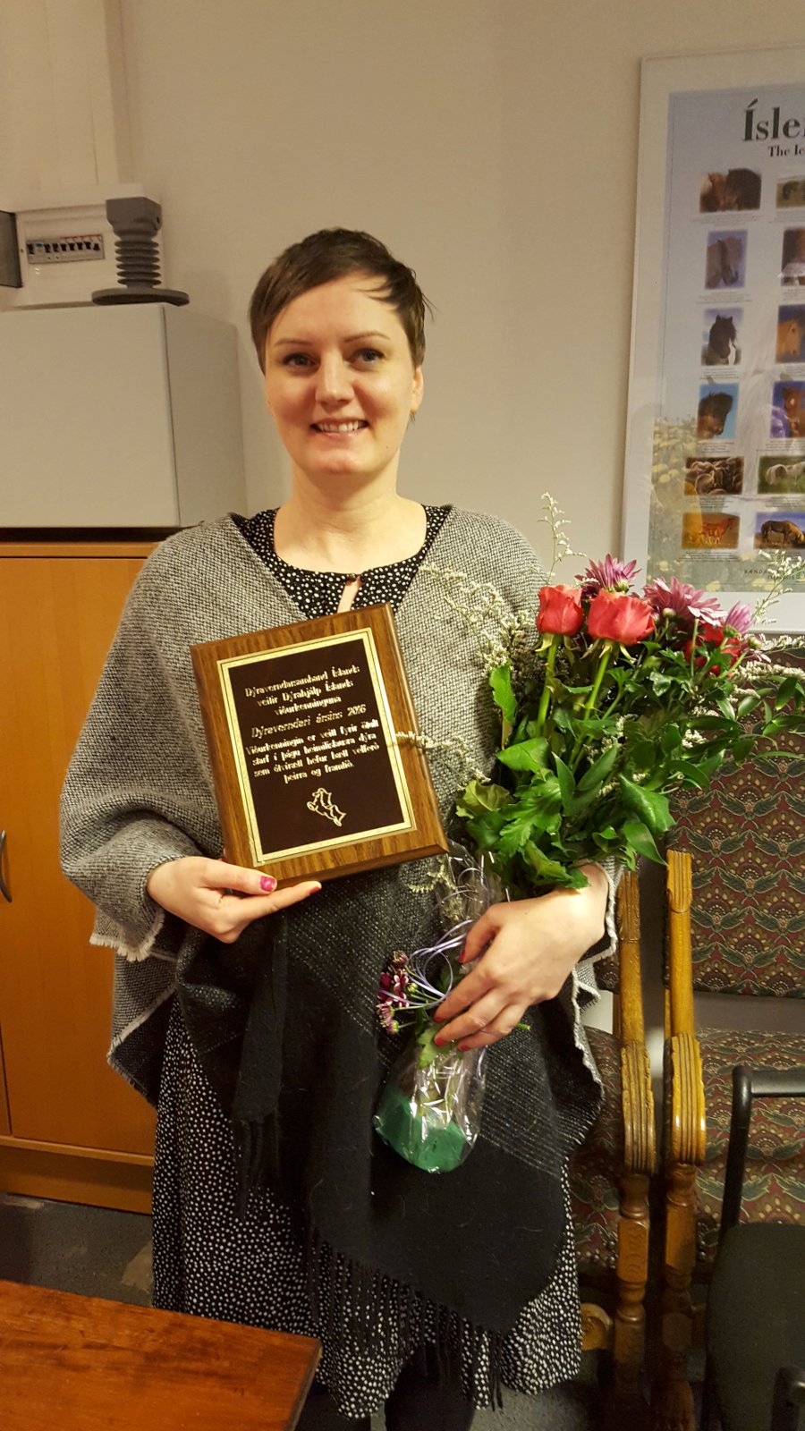 Valgerður Valgeirsdóttir, talsmaður Dýrahjálpar Íslands, kom á málþingið og tók við viðurkenningunni úr höndum Hallgerðar Hauksdóttur, formanns DÍS, og greindi frá starfi félagsins.