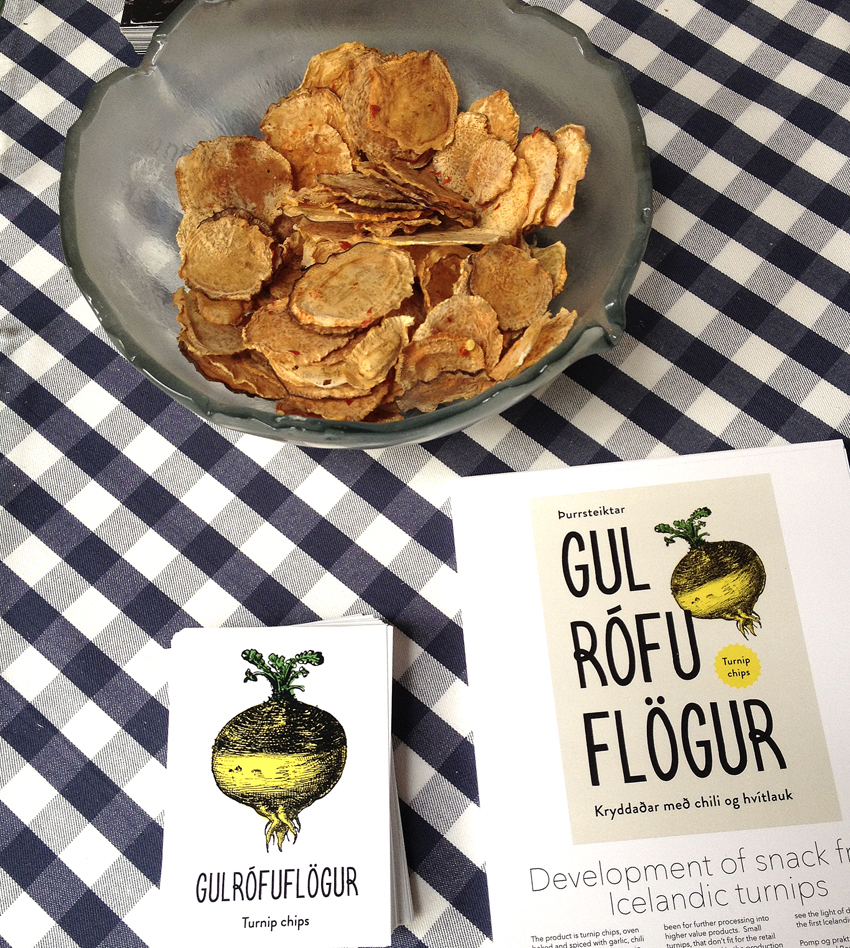„Ég held að gulrófusnakk sé því varla til á plánetunni. Það er þó til ýmiss konar snakk úr rótarávöxtum, eins og rauðrófum og sætum kartöflum sem eru þá djúpsteiktar. Munurinn á okkar snakki er að það er ekki djúpsteikt heldur þurrkað, bakað og kryddað. Það eru engin aukaefni í þessu þannig að þetta verður mjög heilnæmt, c-vítamínríkt og kolvetnissnautt. Þetta er mjög bragðgott og mikil ánægja með þetta hjá þeim sem hafa verið að bragðprófa þetta með okkur við vöruþróunina.“