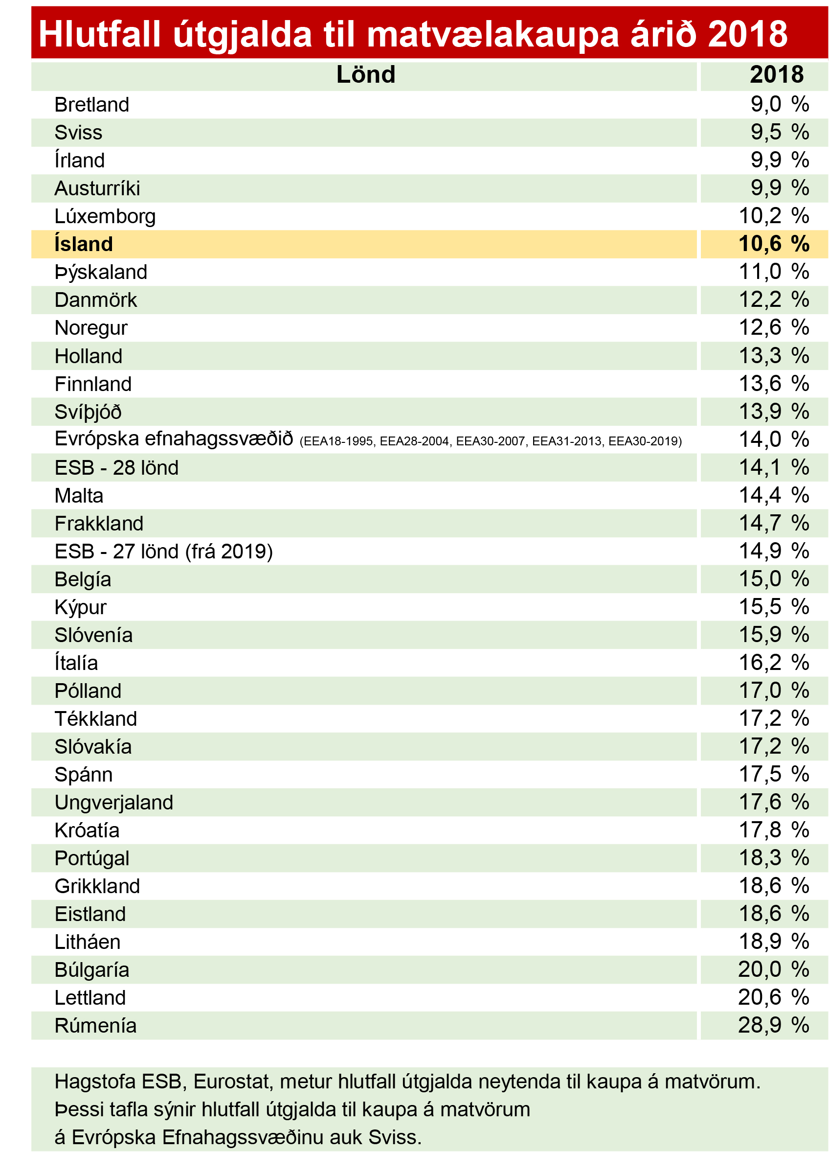 Hlutfall útgjalda neytenda til kaupa á matvörum. Hagstofa ESB, Eurostat, metur hlutfall útgjalda neytenda til kaupa á matvörum. Meðfylgjandi tafla sýnir hlutfall útgjalda til kaupa á matvörum á Evrópska Efnahagssvæðinu auk Sviss árið 2018.