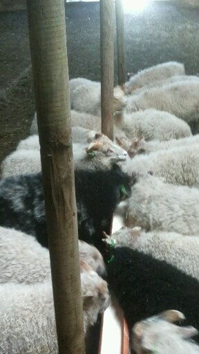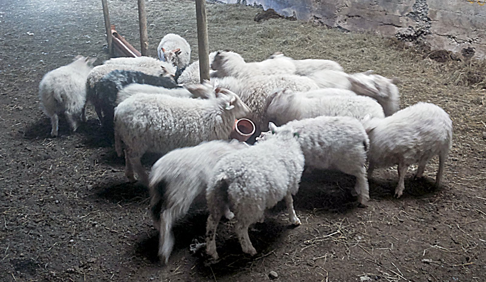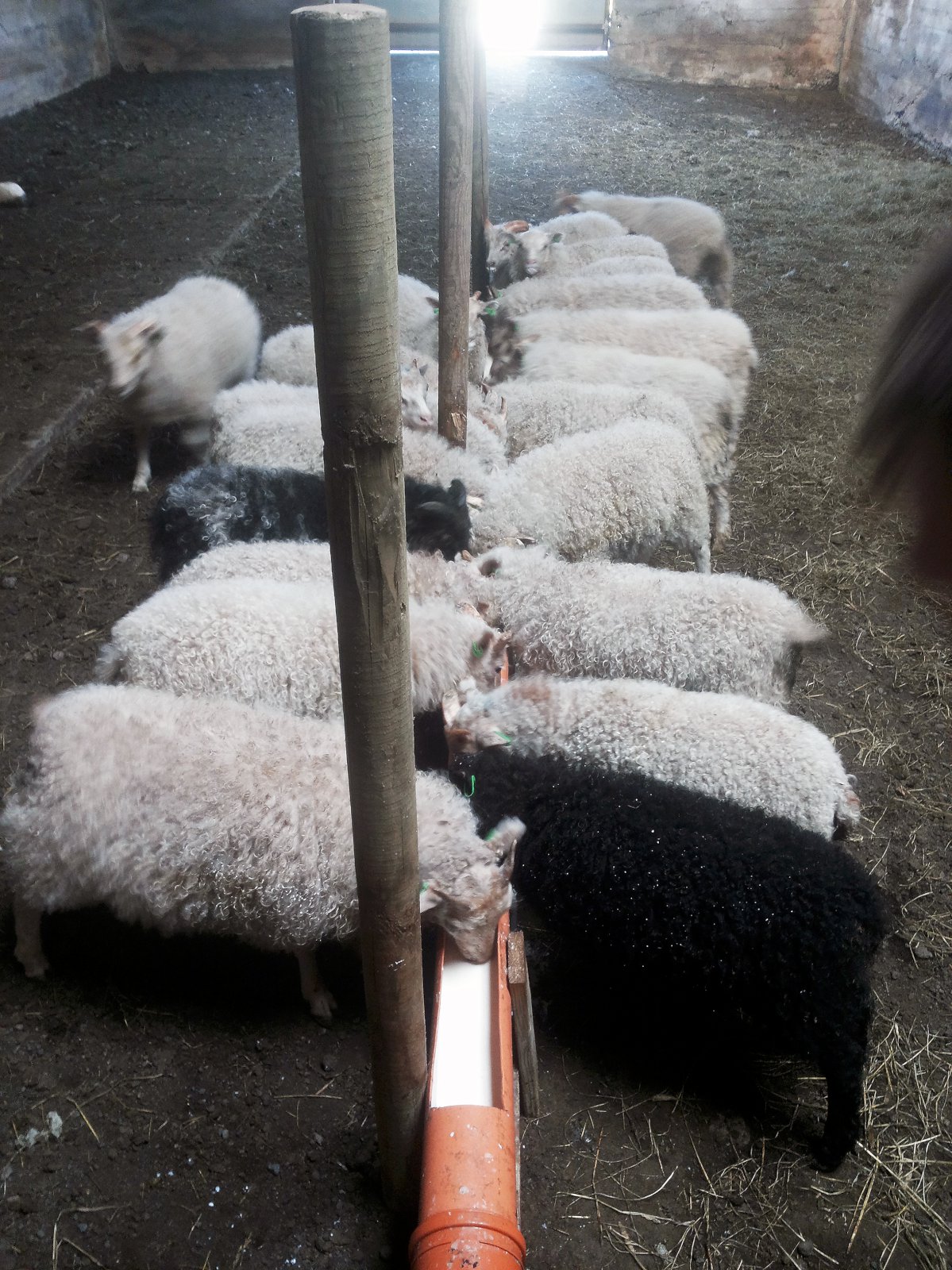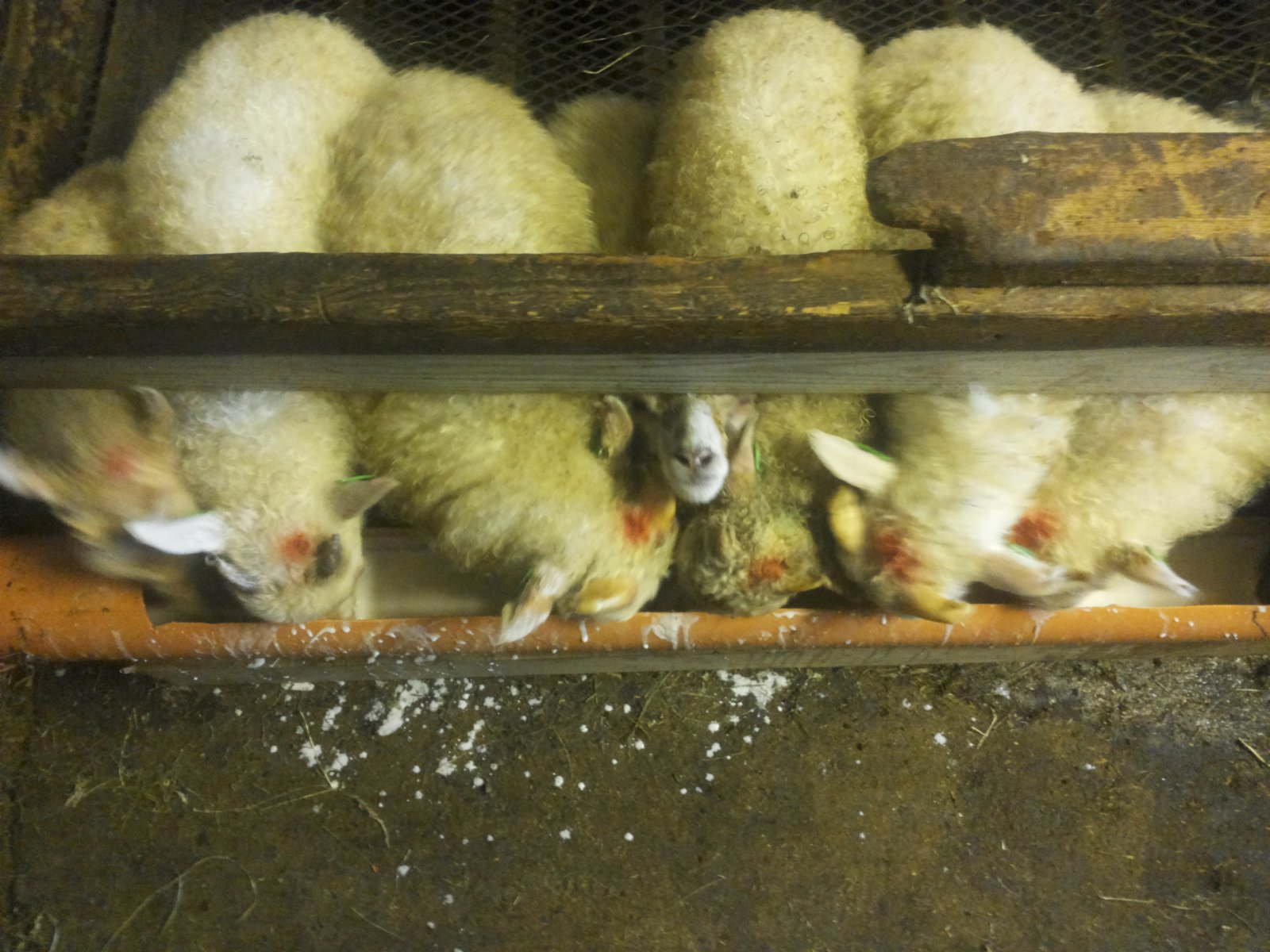 Kjarnfóður er ekki gefið en þau sögðust hafa fyrir örfáum árum látið köggla og fiskimjölsblanda smávegis af þurrheyi. Þessir kögglar eru greinilega sælgæti fyrir lömbin.