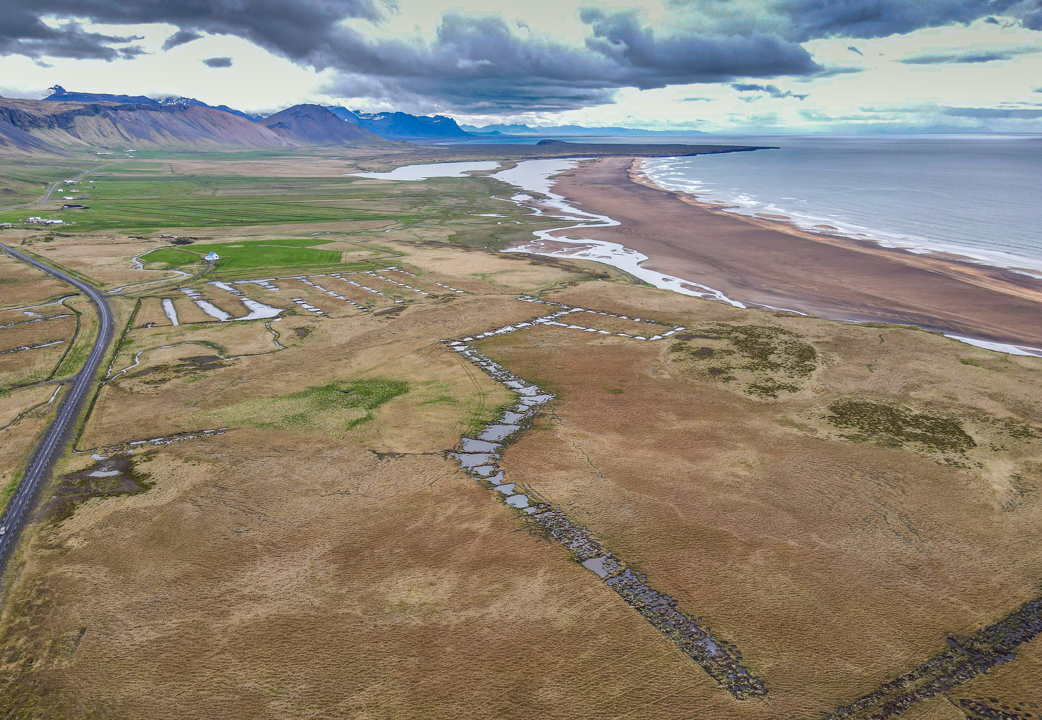 Loftmynd af endurheimtu votlendissvæði í landi Hnausa og Hamraendaá Snæfellsnesi.