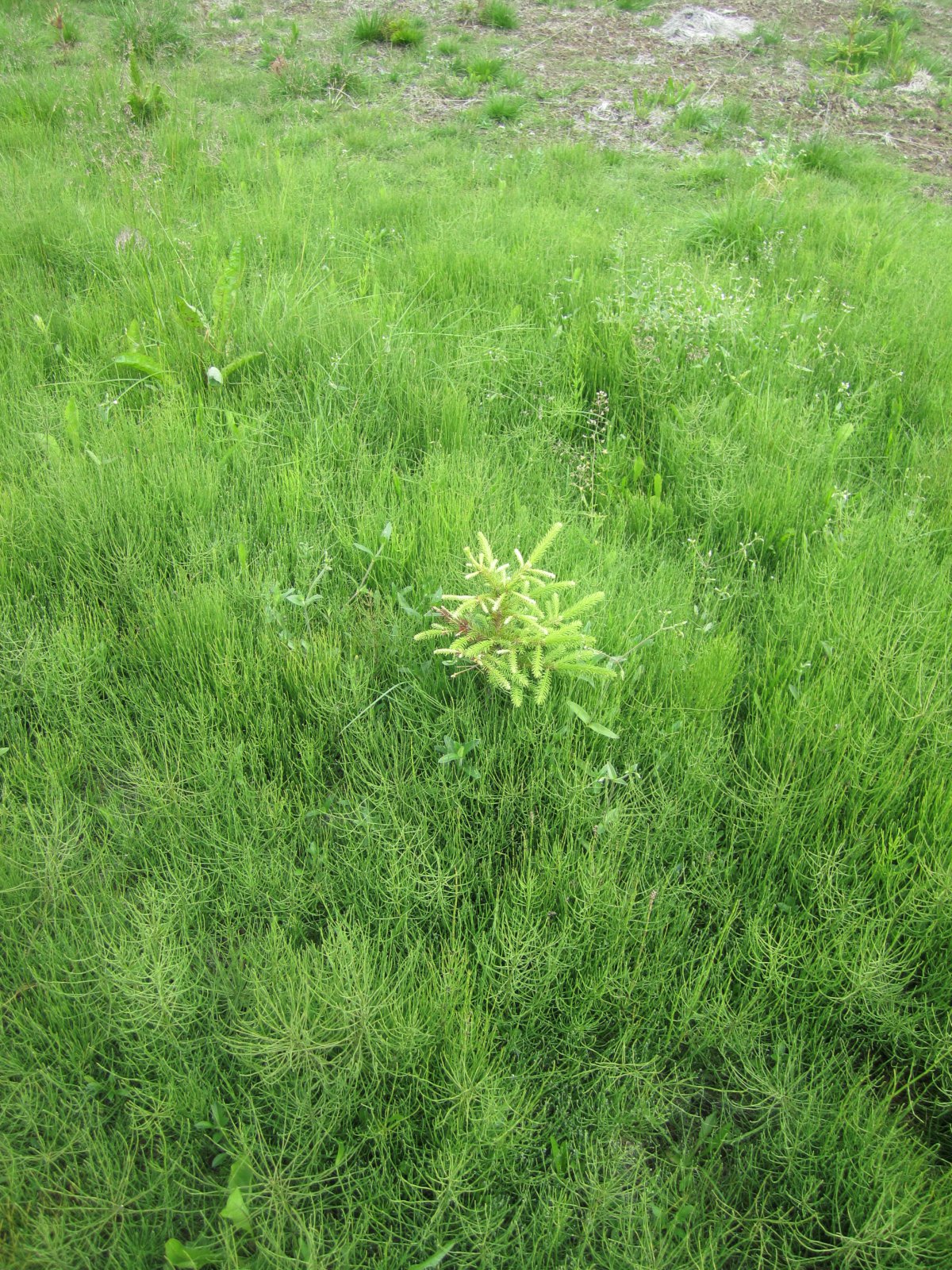 Heilúðun um haustið lofaði góðu í upphafi og virtist hafa hamlandi áhrif á samkeppnisgróðurinn en fljótt fór klóelfting (Equisetum arvense) að þekja jarðveginn (2 mynd). Við úttekt 2013 sást, sérstaklega á rauðgreni, stutt og gulleit barr, sem eru þekkt einkenni eitrunarskemmda (Hartvig, 2012; 3 mynd). Tilraunin sýndi að hvorki úðun tvisvar á vaxtartímanum né heilúðun að hausti dugði ekki til að halda samkeppnisgróðrinum niðri.