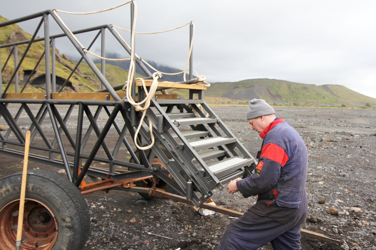Kristján segir að stálgrindurnar sem fengust hafi ekki reynst haft nægan styrk einar og sér. Voru þær því styrktar með skúffubitum að neðanverðu og eins var smíðað handrið sem er hluti af burðarvirkinu. Jafnframt var brúin lítillega forspennt. Hjólabúnaður brúarinnar eru framöxlar úr Mercedes Benz vörubíl með beygjubúnaði sem hægt er að tengja við dráttarbeisli.