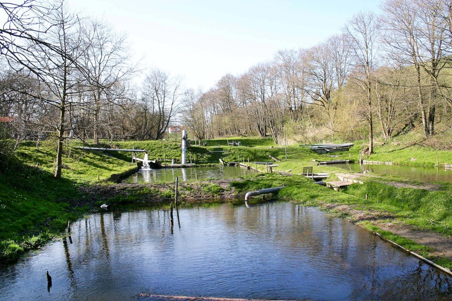 Upphaf þessarar búgreinar í Danmörku má rekja aftur til þarsíðustu aldamóta þegar eldi á urriðum hófst í litlum tjörnum inni í landi. Tjarnir þessar voru grafnar út og svo leitt í þær vatn úr nálægum ám eða lækjum. Yfirfallinu var svo veitt aftur út í ána eða lækinn og í raun er stærsti hluti framleiðslunnar í dag enn með þessu formi. Þó nokkuð er enn um tiltölulega einfaldar tjarnir þó svo að steyptar þrær finnist einnig. Yfirfallið er þó allverulega breytt nú orðið, og í dag er notast við afar fullkominn hreinsibúnað sem hreinsar vatnið áður en því er aftur veitt út í ána eða lækinn. Í slíkum hreinsibúnaði eru möguleg næringarefni og önnur lífræn efni í vatninu botnfelld og svo er vatnið leitt frá kerfinu í gegnum þar til gerða síu svo tryggja megi að eldisfiskurinn nái ekki að berast út í náttúruna.