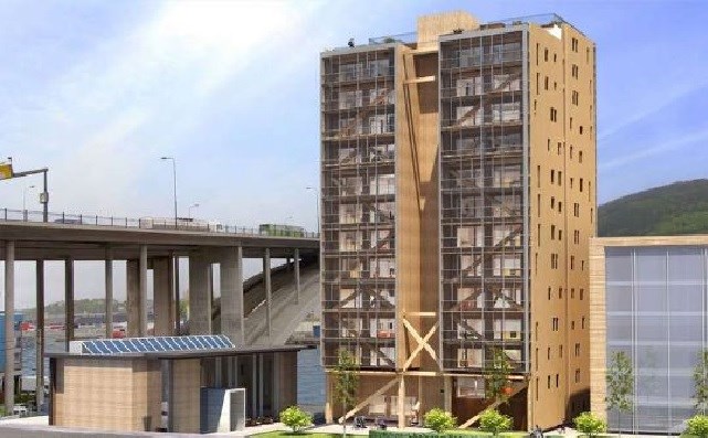 Sjálfbærni og binding koltvísýrings hafði mikið að segja um þá ákvörðun byggingafélagsins BOB BBL að reisa þessa fjórtán hæða byggingu sína úr timbri en ekki öðrum byggingarefnum. Það segir Kenneth Øivind Monsen, kynningarfulltrúi fyrirtækisins. Byggingin er kölluð Tréð (Treet). Grindin er gerð úr rammgerðum límtrésbitum og byggingarlagið hið sama og algengt er við smíði trébrúa. Í grindina var svo raðað tilbúnum timbureiningum sem framleiddar voru í Eistlandi. Monsen segist aðspurður telja að timburháhýsum muni fjölga á komandi árum enda lofi húsið nýja í Björgvin mjög góðu.