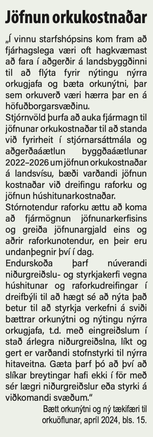 „Aflnotkun innan dagsins í almenna raforkukerfinu getur sveiflast um 200 MW og árstíðasveiflan milli júlí og desember er einnig um 200 MW, en til að setja það í samhengi þá er uppsett afl Hellisheiðarvirkjunar, næststærstu virkjunar landsins, um 300 MW í rafmagni. Það er því mikilvægt að leita leiða til að fletja út orkukúrfuna yfir daginn og lengja nýtingartíma flutnings- og dreifikerfisins með hagrænum hvötum og aukinni samkeppni