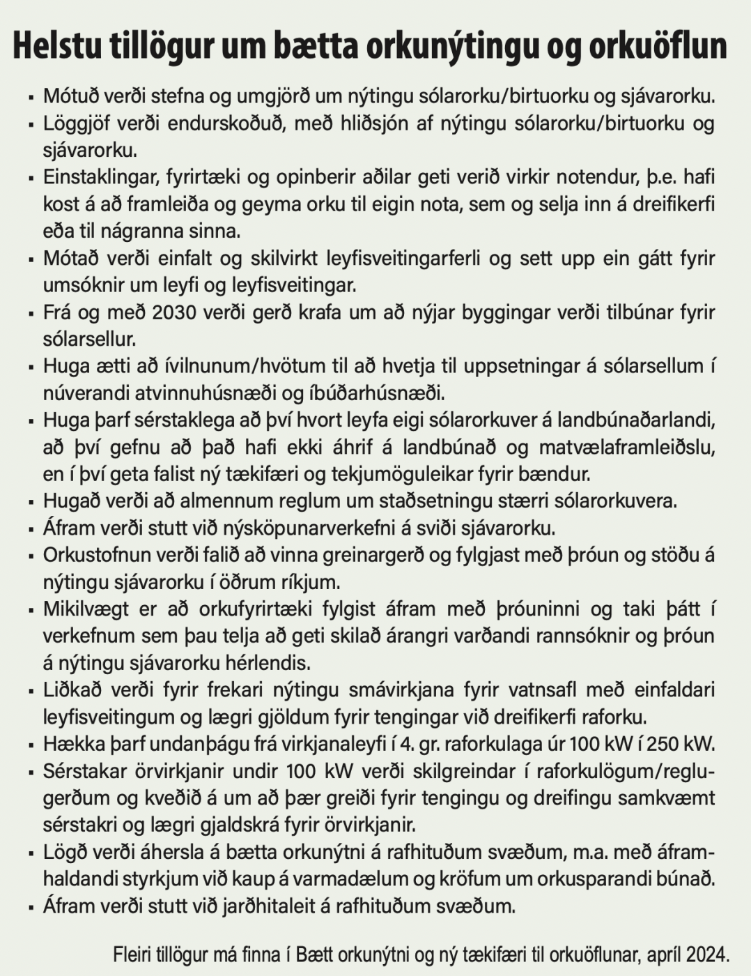 Út er komin skýrslan Bætt orkunýtni og ný tækifæri til orkuöflunar. Hún hefur að geyma um 50 tillögur sem m.a. snúa að sólarorku, sjávarorku, smávirkjunum fyrir vatnsafl, varmadæluvæðingu á smærri og stærri skala, bættri orkunýtni og sveigjanlegri orkunotkun.