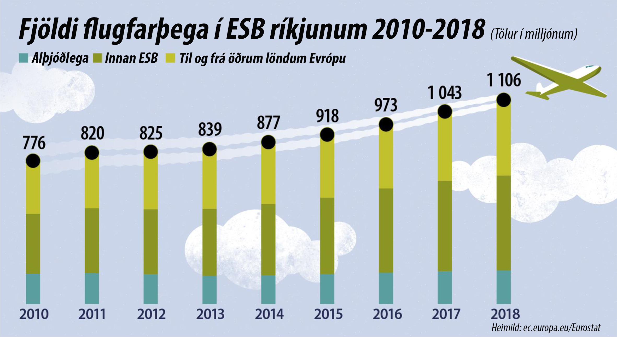 Þrátt fyrir allt tal og kröfur um nauðsyn þess að berjast gegn losun gróðurhúsalofttegunda og mikinn fjölda alls konar ráðstefna og funda þar sem þau mál ber á góma, þá fer flugfarþegum í löndum Evrópusambandsins ört fjölgandi. Á árinu 2018 samsvaraði farþegafjöldinn í ESB-löndum því að hver einasti íbúi Evrópusambandsins hafi farið í tvær flugferðir það ár og rúmlega það.