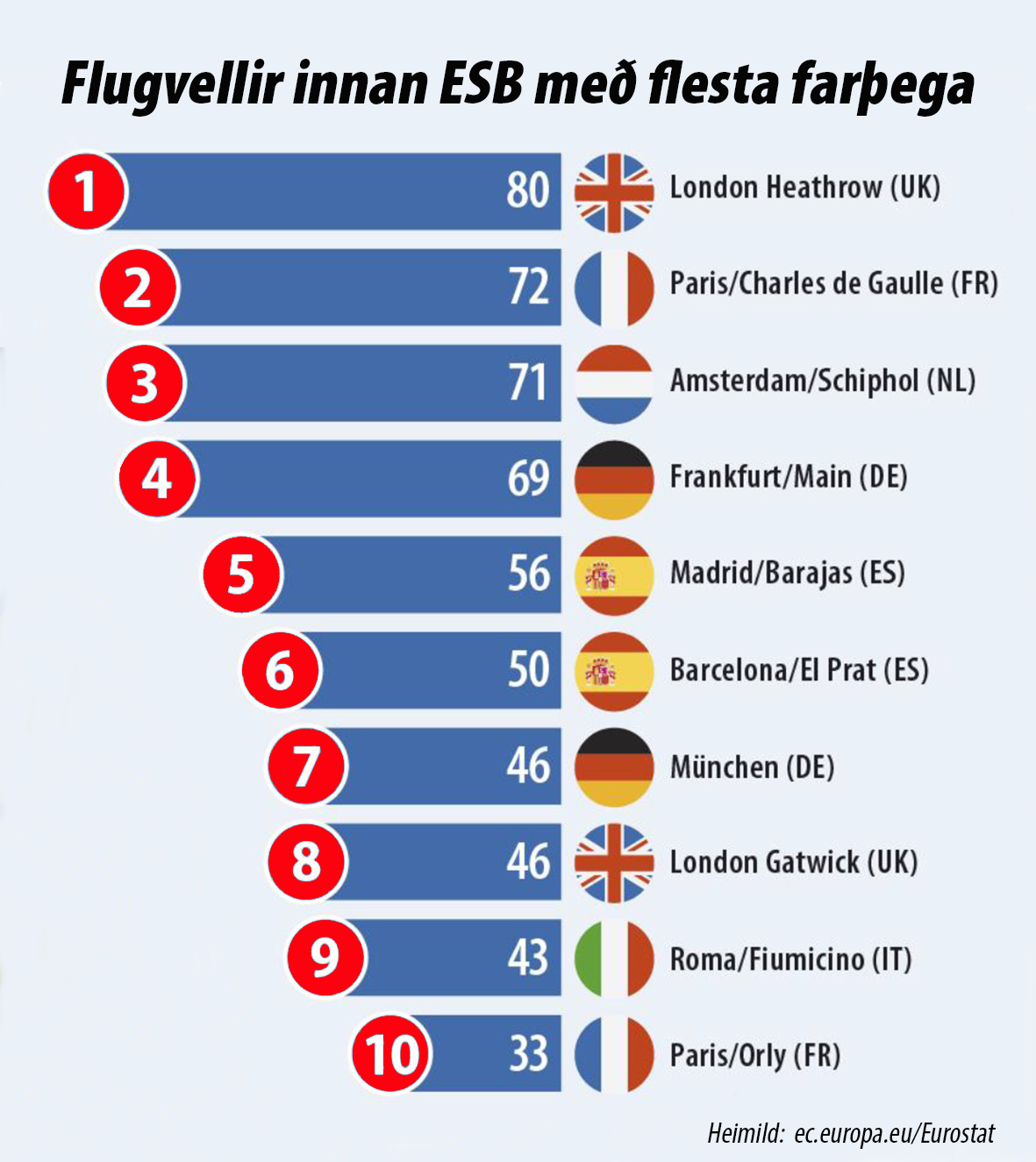 Miðað við þetta kemur ekki á óvart að Bretland var með flesta flugfarþega á síðasta ári, eða um 272 milljónir. Næst kom Þýskaland með 222 milljónir, Spánn var með 221 milljón, Frakkland með 162 milljónir og Ítalía var í fimmta sæti með 153 milljónir flugfarþega.