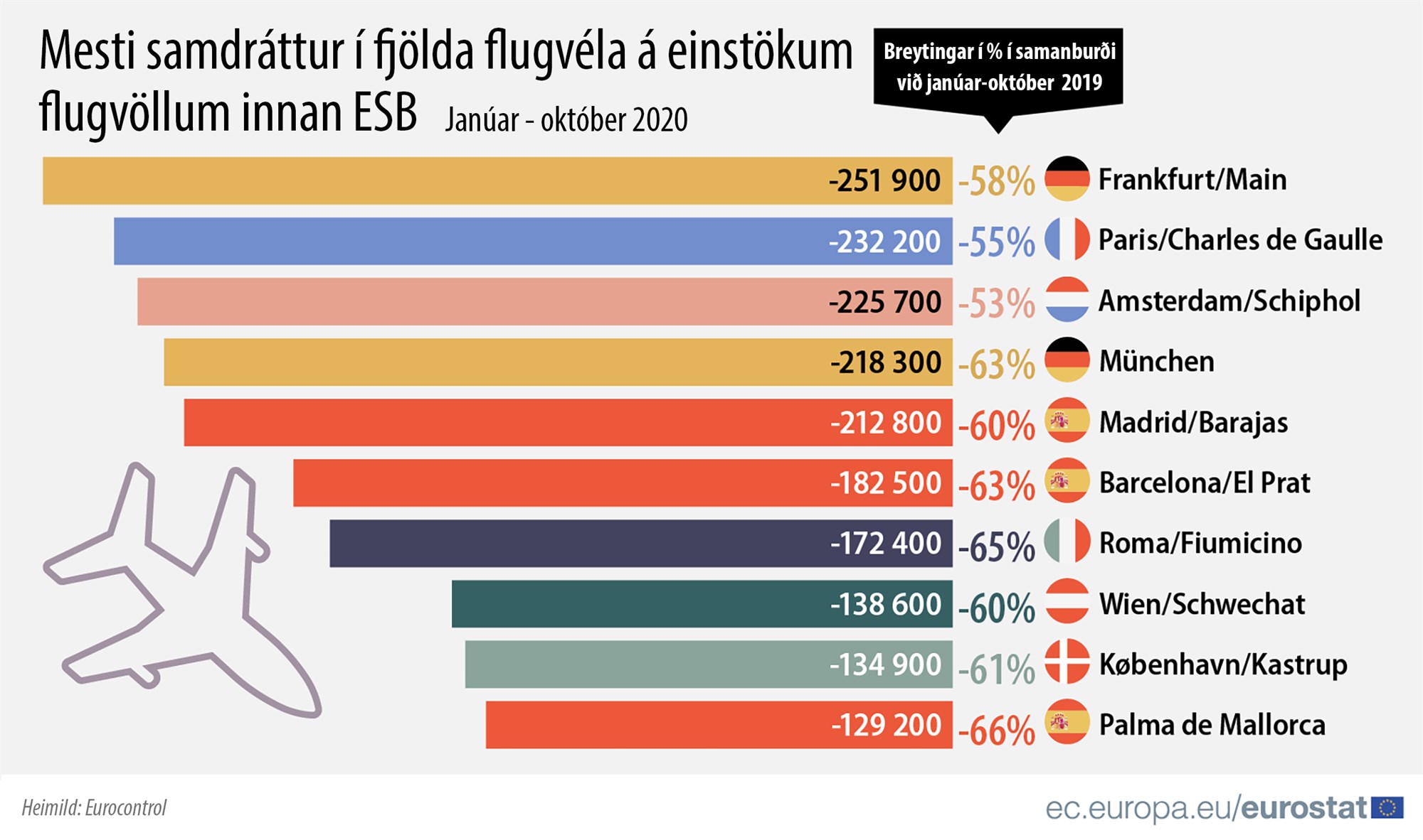 Þegar litið er á samdrátt í fjölda flugvéla sem fóru um einstaka flugvelli í ESB-löndunum á tímabilinu janúar til október 2020 er staðan hreint út sagt hrikaleg. Af þeim tíu flugvöllum þar sem samdrátturinn var mestur í fjölda flugvéla var mest fækkun um Main-flugvöll í Frankfurt í Þýskalandi og nam 251.900 vélum, eða um -58%. Næstur kom Charles de Gaulle flugvöllur í París í Frakklandi með fækkun upp á 232.200 flugvélar, eða um -55%. Síðan er Schiphol flugvöllur í Amsterdam í Hollandi með fækkun upp á 225.700 flugvélar eða um -53%. München flugvöllur í Þýskalandi kemur svo í fjórða sæti með fækkun upp á 281.300 flugvélar eða um -63%. Í fimmta sæti yfir mesta fækkun í fjölda véla er Barajas flugvöllur í Barselóna á Spáni með 212.800 vélar, eða um -60%. Þá kemur Fiumicino flugvöllur í Róm á Ítalíu með fækkun flugvéla upp á 172.400, eða um -65%. Síðan Schwechat flugvöllur í Vín í Austurríki með 138.600 flugvéla samdrátt, eða um -60%.  Í níunda sæti kemur svo Kastrup flugvöllur í Kaupmannahöfn í Danmörku með fækkun upp á 134.900 flugvélar, eða um -61%. Í tíunda sæti er svo flugvöllurinn í Palma á Mallorca á Spáni. Þar fækkaði flugvélum sem fóru um völlinn um 129.200, eða um 66%. Þar var hlutfallsleg fækkun flugvéla líka mest.