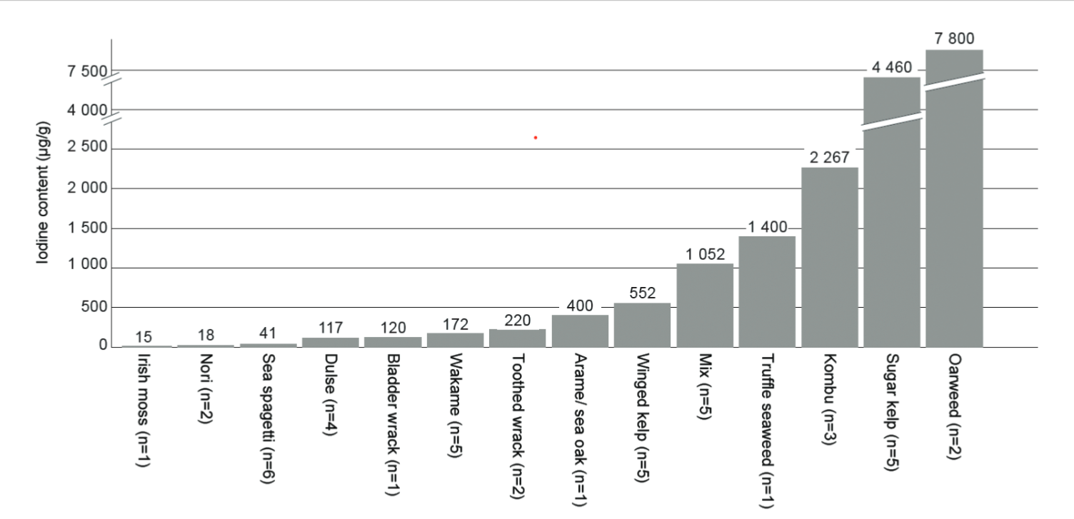 Í rannsókn sem gerð var af stofnuninni Food & Nutrition Research (FNR) var meðal annars greint frá magni joðs í þörungum og birtu þeir er að rannsókninni stóðu myndræna skýringu á því eins og sést hér að ofan.