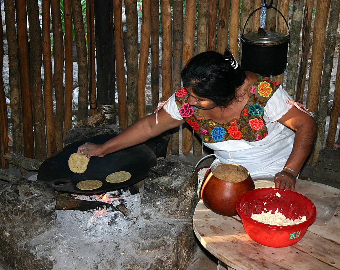 Maísbrauð sem hnoðað var í bollur eða flatt út var eldbakað á heitum steinum eða frumstæðum steinofnum.
